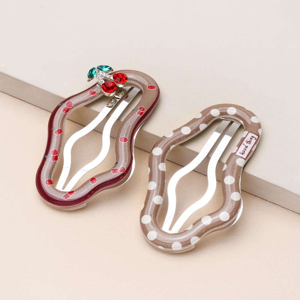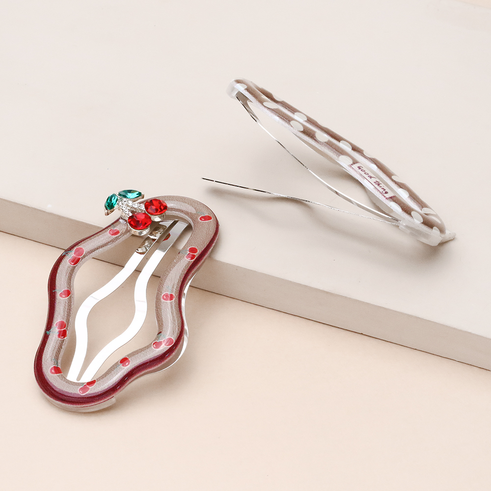 یکی از سنجاقها با *طرح گیلاس برجسته و حاشیه قرمز ظریف تزیین شده که حسی شاداب و دخترانه دارد.