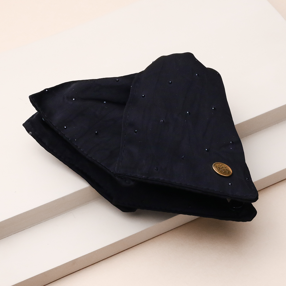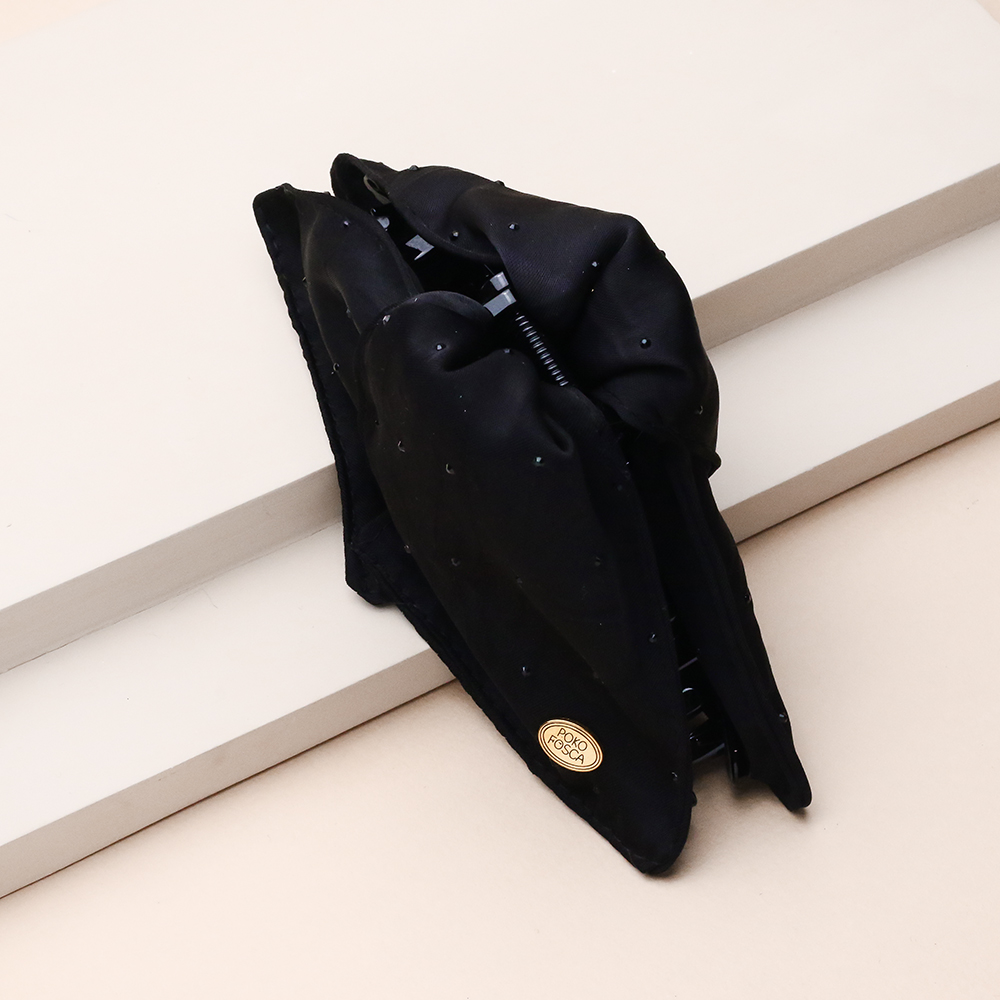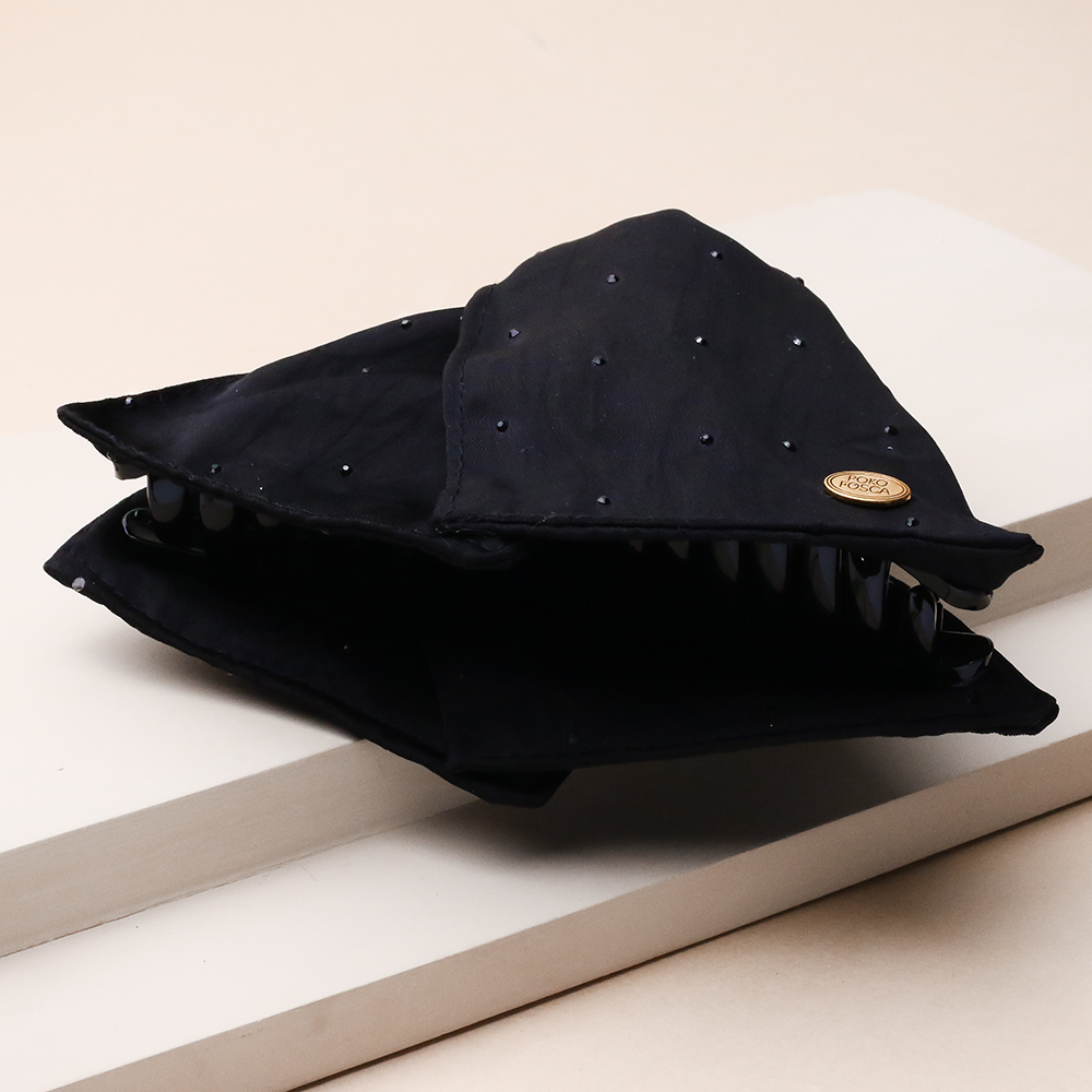 کلیپس تمام پارچه ای مشکی، این کلیپس موی منحصربهفرد، تلفیقی هنرمندانه از کارایی و نرمی است. برخلاف مدلهای معمول، تمام بدنه این کلیپس با پارچهای باکیفیت و مشکیرنگ پوشیده شده که لمسی از لطافت را به دستان و موهای شما هدیه میدهد. بافت پارچه با نقاط بسیار ریز و درخشان مزین شده که در نور، جلوهای درخشان پیدا میکند.