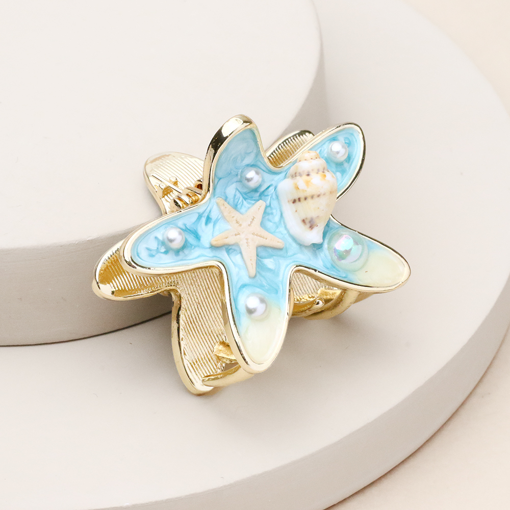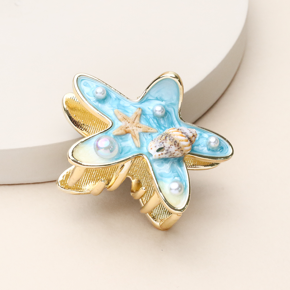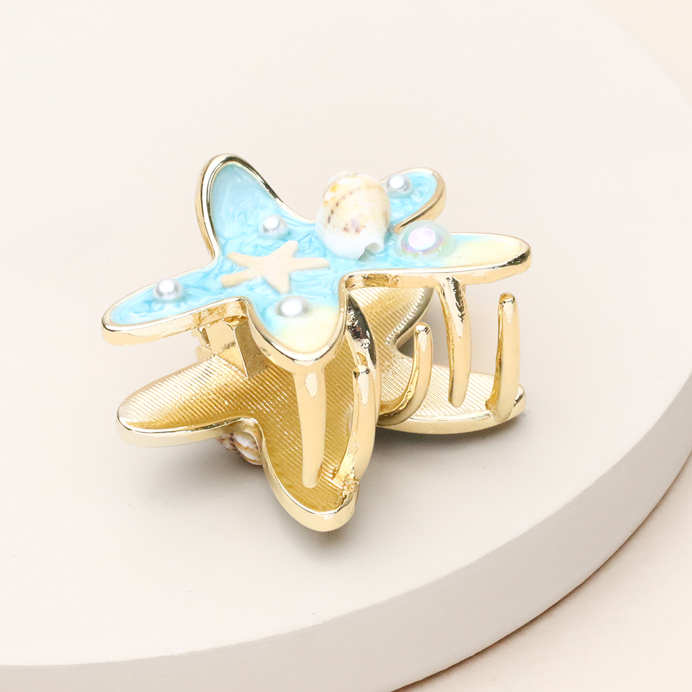 کلیپس ستاره دریا فانتزی با طرح ستاره دریایی و رنگ آبی صدفی، انتخابی رویایی برای طرفداران استایل‌های خاص و تابستانی است. بدنه فلزی آن با آبکاری طلایی باکیفیت ساخته شده که در ترکیب با پوشش صیقلی و براق ستاره، جلوه‌ای درخشان و جذاب به موها می‌بخشد. فنر محکم و دندانه‌های استاندارد این کلیپس، موها را به خوبی در جای خود ثابت نگه می‌دارد و طراحی مینیمال و در عین حال متفاوت آن، برای استفاده روزمره و دورهمی‌های دوستانه انتخابی عالی است.