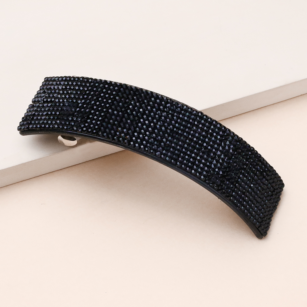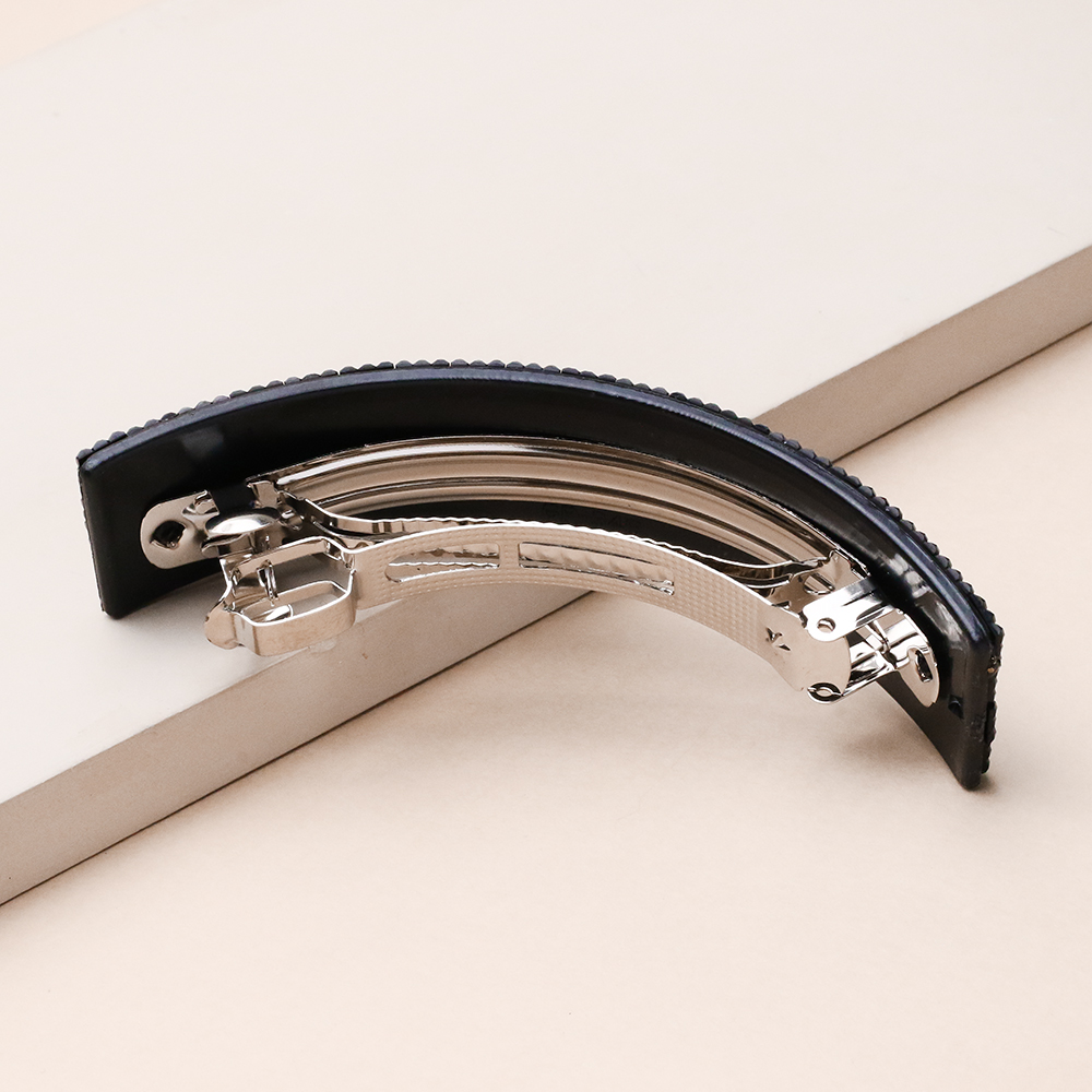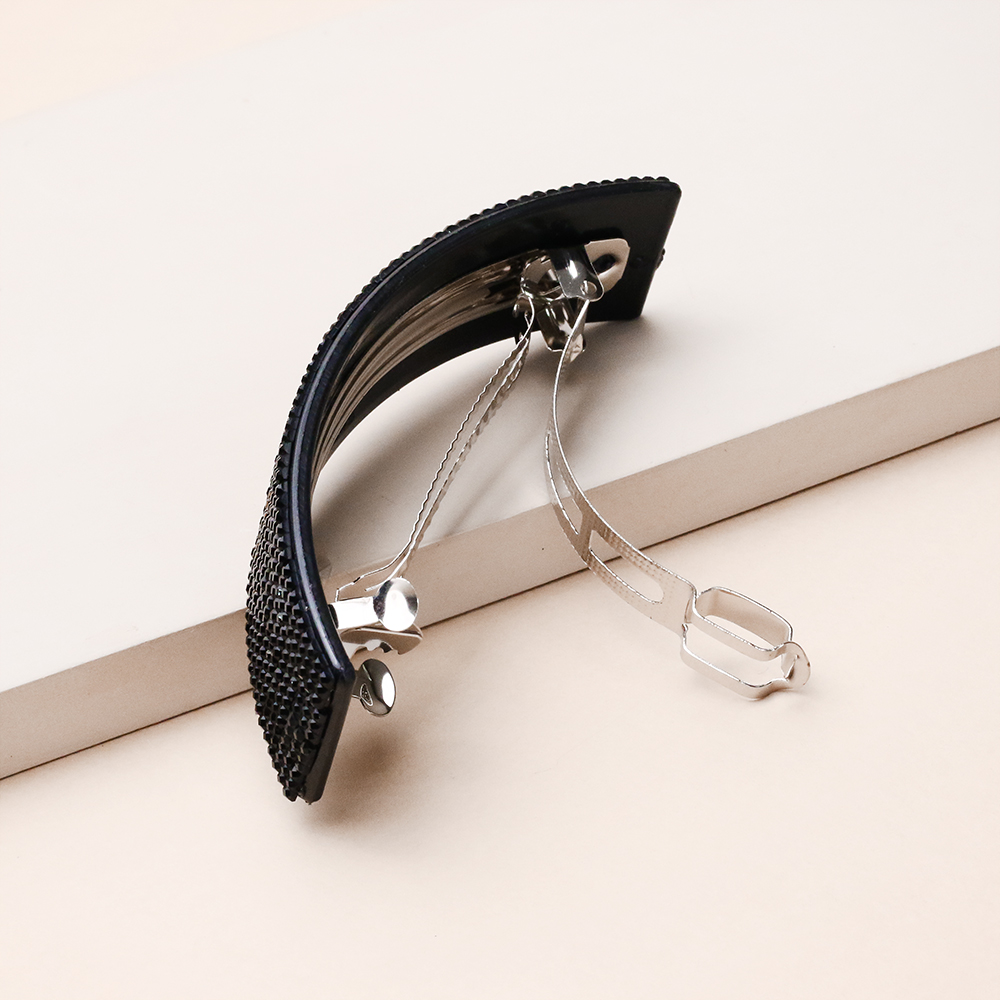 کلیپس سنجاقی مشکی با رویه درخشان و بافت‌دار، انتخابی کلاسیک و در عین حال مدرن برای آراستن موهای شماست. تلالو ملایم و رنگ مشکی عمیق این سنجاق، جلوه‌ای از وقار و شیک‌پوشی را به استایل شما می‌بخشد. طراحی ظریف و کشیده این مدل، آن را برای استفاده در موقعیت‌های مختلف، از محیط کار تا مهمانی‌های شبانه، به یک اکسسوری ضروری و همه‌کاره تبدیل کرده است