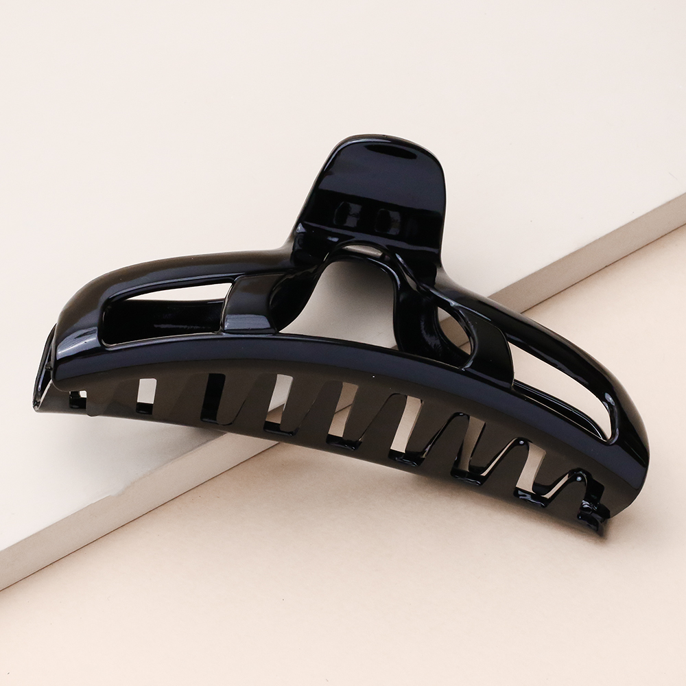کلیپس قایقی مشکی بزرگ، این کلیپس موی کلاسیک و کاربردی، با طراحی کشیده و موسوم به "قایقی"، بهترین همراه برای بانوانی است که موهای پُرپشت و بلند دارند. رنگ مشکی شفاف و درخشان این کار، حسی از انرژی و جسارت را القا میکند و به دلیل سایز بزرگش، به راحتی تمام حجم موهای شما را در بر میگیرد.