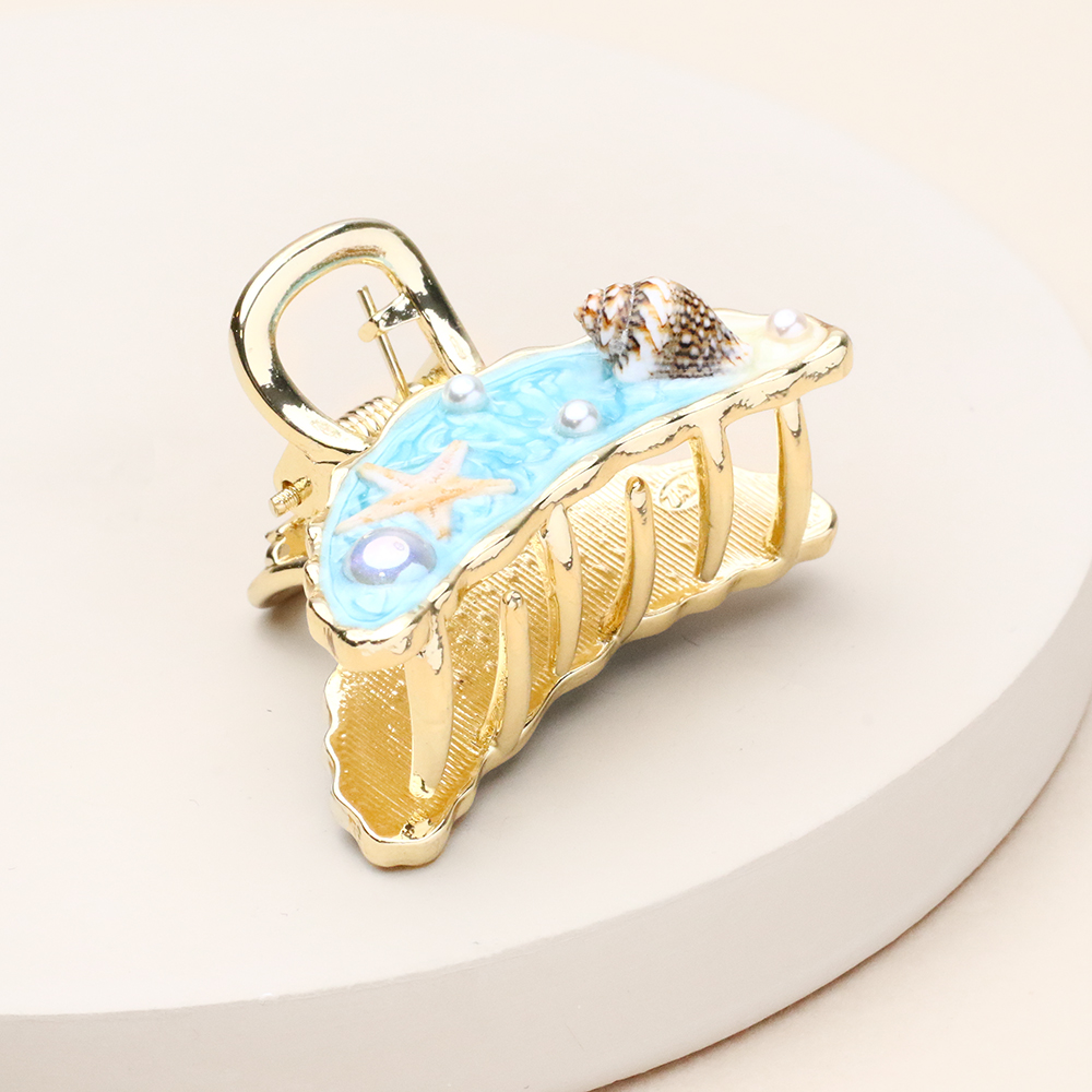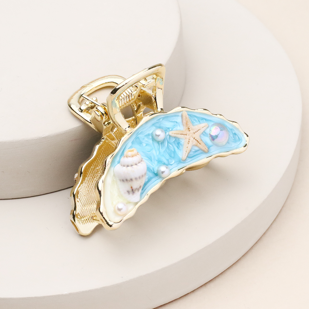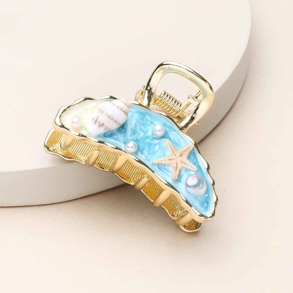 کلیپس هلالی دریا با طرح دریا، قطعه‌ای از آرامش ساحل را به موهای شما هدیه می‌دهد. ترکیب طیف‌های آبی اقیانوسی، سفیدِ کف‌مانند و تزئینات ظریفِ صدفی در بدنه‌ی شفاف آن، استایلی خاص و فانتزی ایجاد کرده است. فرم هلالی و مدرن این کار در کنار فنر مستحکم، انتخابی عالی برای جمع کردنِ مطمئن و شیک موها در روزهای گرم تابستانی و استایل‌های کژوال است.