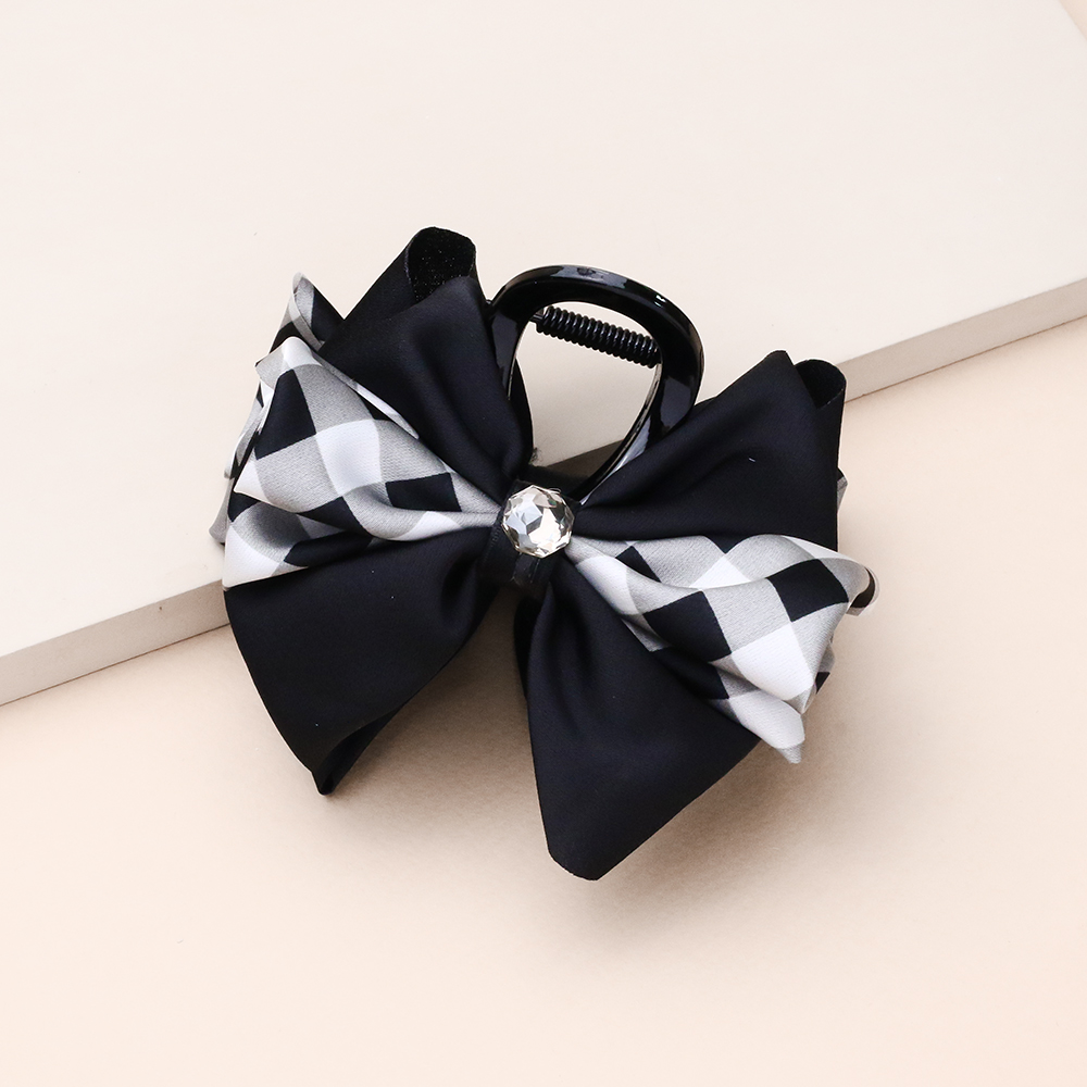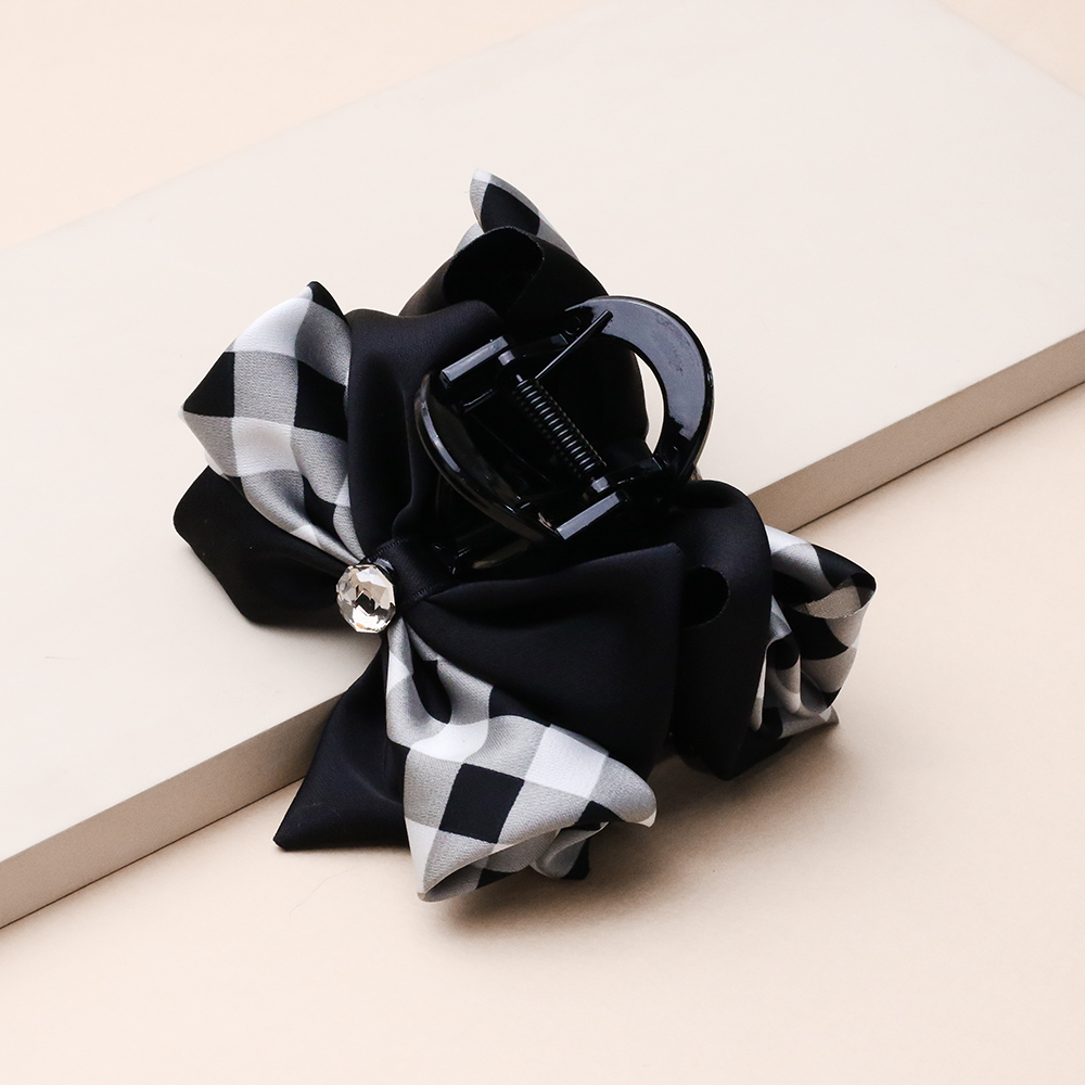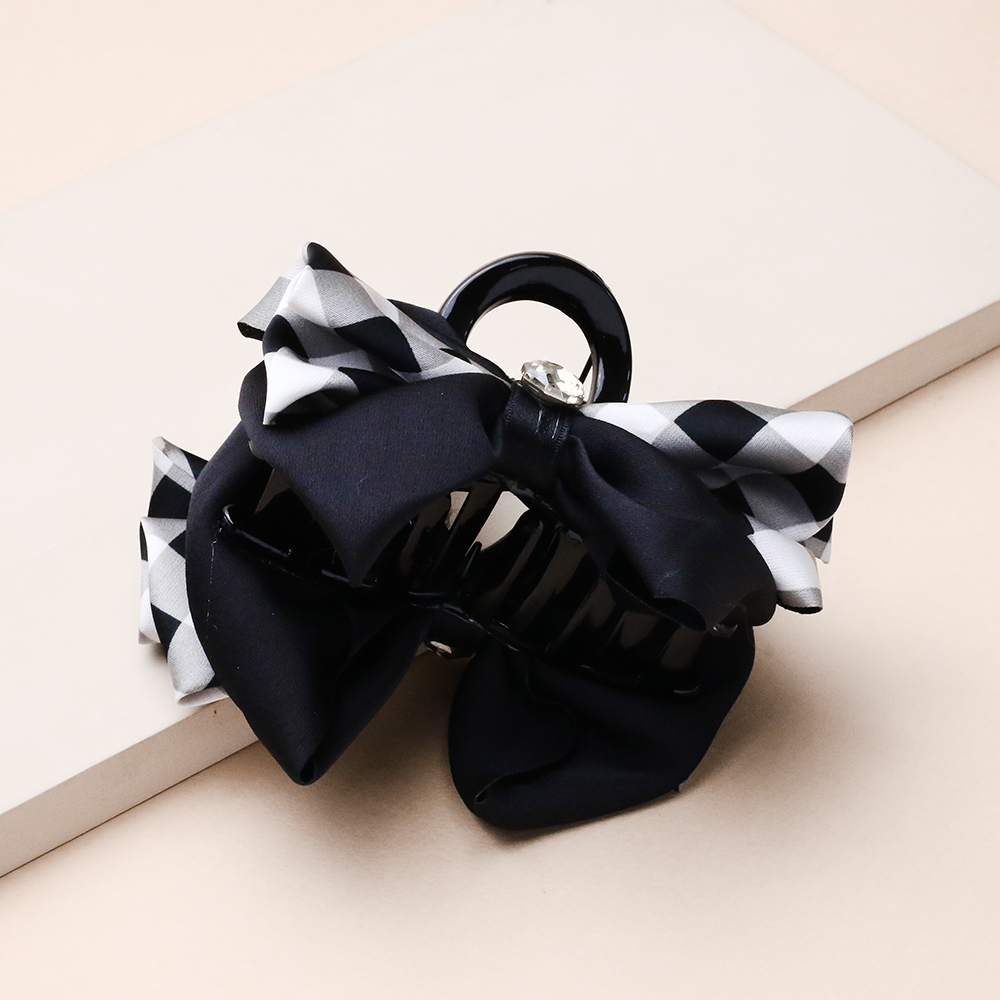 کلیپس پاپیون پارچه ای شطرنجی کلاسیک و ترکیب رنگی مشکی و سفید، انتخابی ظریف و فانتزی برای جلوه بخشیدن به موهای شماست. بافت پارچه‌ای و نرم پاپیون در کنار نگین درخشان وسط آن، تضادی جذاب ایجاد کرده که هم برای استایل‌های روزمره و هم برای موقعیت‌های نیمه‌رسمی بسیار مناسب و چشم‌نواز است.
