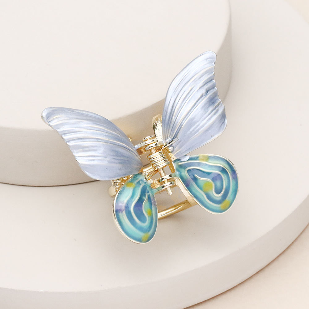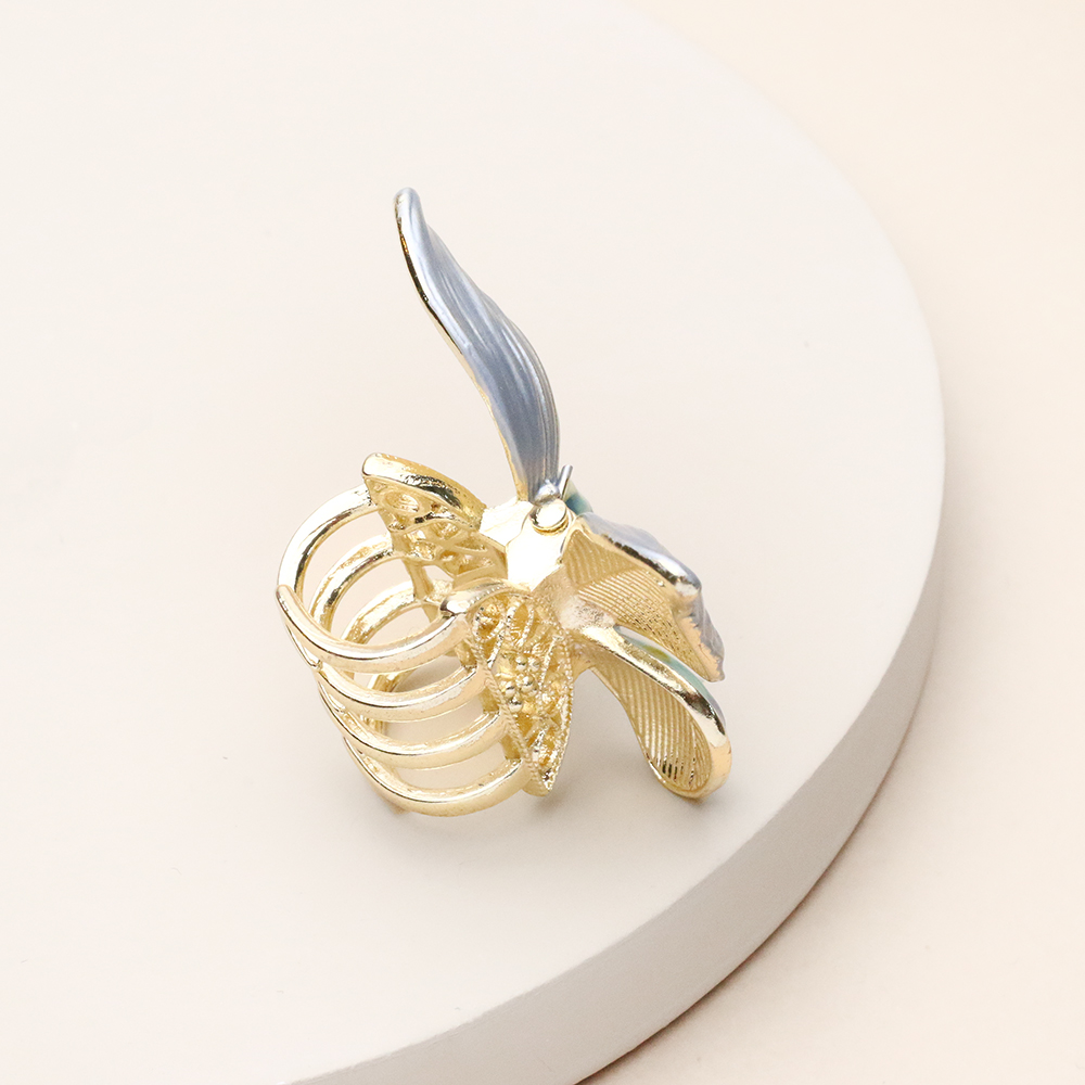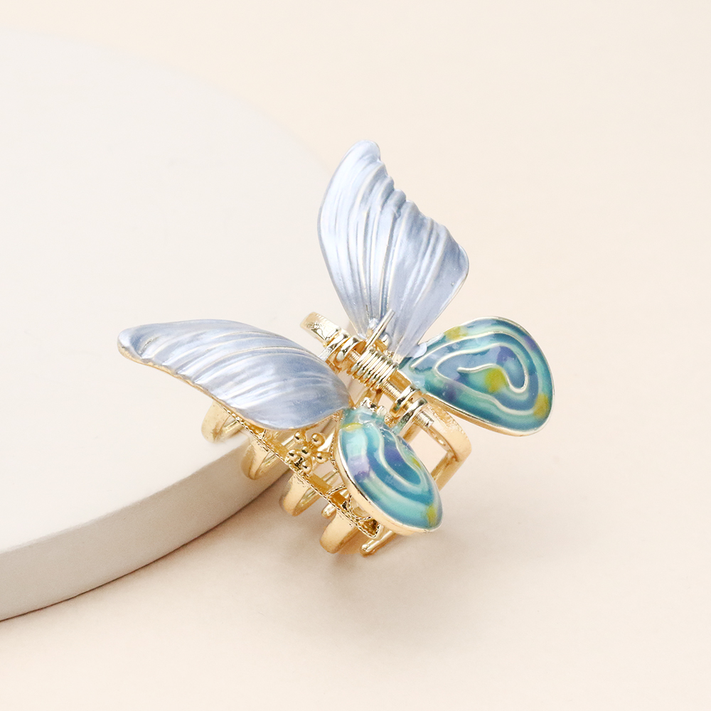 کلیپس پروانه طوسی آبی با بالهای دو رنگ طوسی و آبی، با ظرافت روی موهای شما مینشیند تا به استایلتان روحی تازه ببخشد. بدنه این کار از فلز مقاوم با آبکاری طلایی ساخته شده که در کنار رنگ ملایم بالها، تضادی درخشان و خیرهکننده ایجاد میکند. بالهای بالایی به رنگ طوسی صدفی و بالهای پایینی با نقشونگارهای آبی طراحی شدهاند تا حسی از لطافت و رهایی را منتقل کنند. فنر مستحکم این کلیپس به خوبی موها را در بر میگیرد و برای کسانی که به دنبال یک اکسسوری خاص و الهامگرفته از طبیعت هستند، انتخابی بینظیر است.