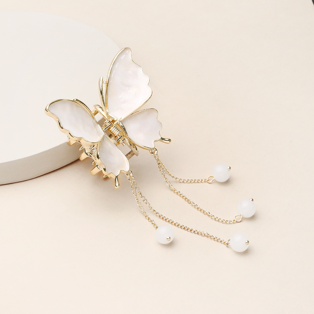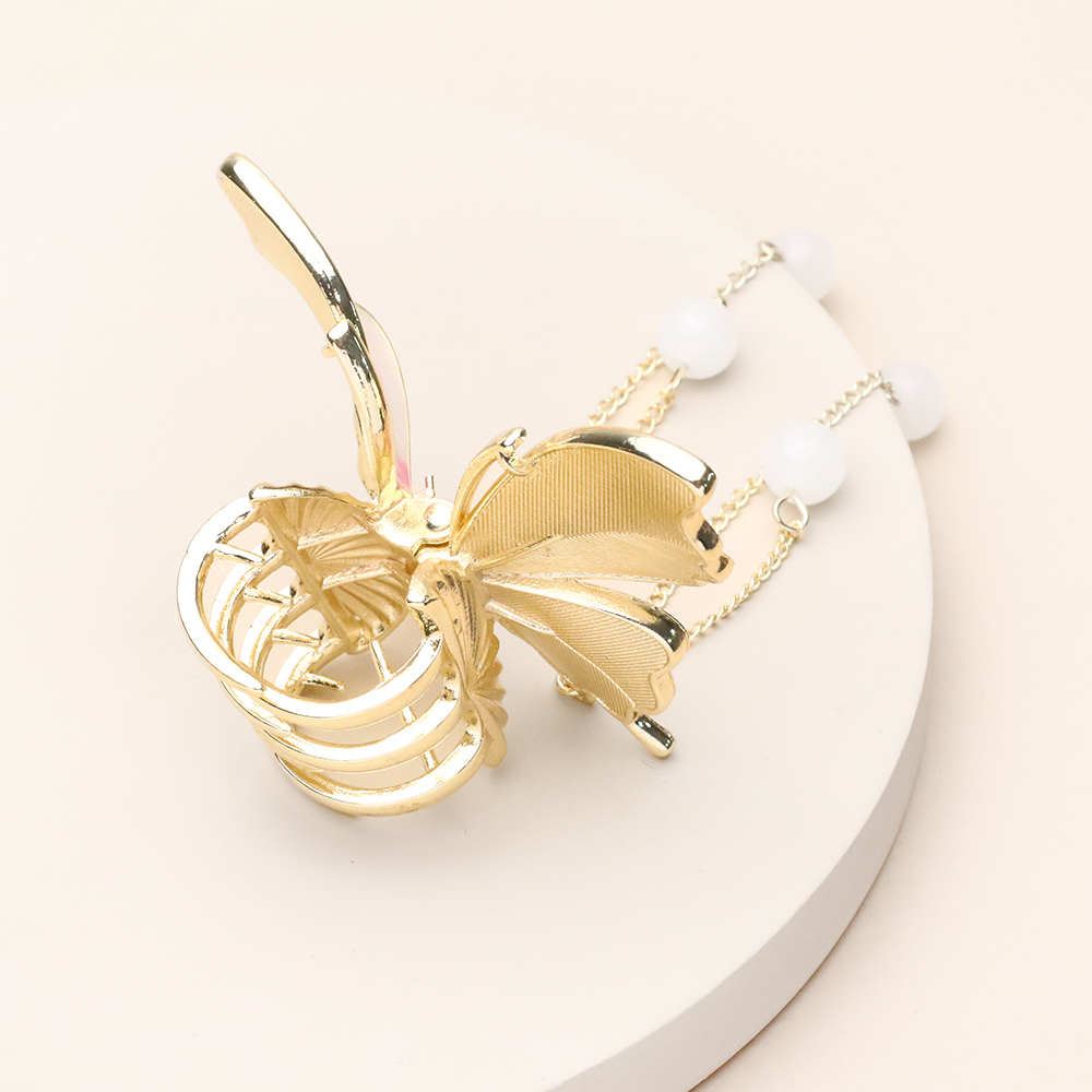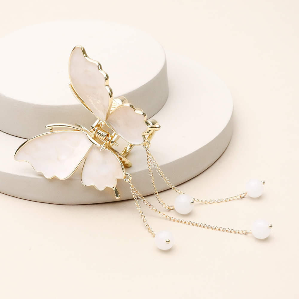 کلیپس پروانه کرم آویزدار با رنگ کرم صدفی و آویزهای زنجیری بلند، تجسمی از ظرافت و شکوه در کنار هم است. بدنه فلزی با آبکاری طلایی و بالهای صیقلی، درخشش بینظیری به این اکسسوری بخشیده و آویزهای منتهی به گویهای کوچک، با هر حرکت سر، جلوهای پویا و چشمنواز لای موهای شما ایجاد میکنند. فنر مستحکم این کار، موها را به خوبی در جای خود ثابت نگه میدارد و طراحی رومانتیک آن، انتخابی ایدهآل برای تکمیل یک استایل مجلسی و خاص است.
