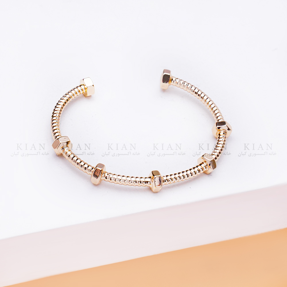 این دستبندها با طراحی پیچخورده و باز ساخته شدهاند و بهصورت کشیده دور مچ قرار میگیرند. فرم پیچدار، جلوهای مدرن و خاص به دستبند میبخشد و مهرههای ظریف کار شده روی بدنه، زیبایی و ظرافت آن را دوچندان میکنند. این مدلها در دو رنگ پرطرفدار طلایی و نقرهای عرضه شدهاند تا مطابق سلیقه و استایل شما انتخاب شوند.