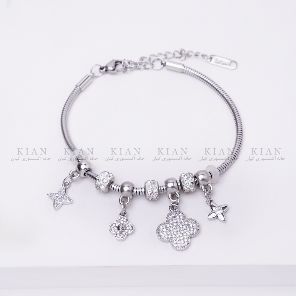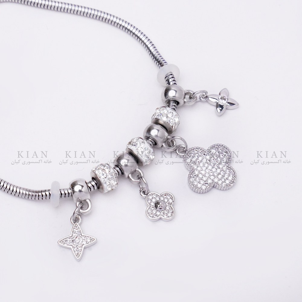 دستبند آویزدار ونکلیف و ستاره از برند خانه اکسسوری کیان، ترکیبی از اصالت و درخشش مدرن است. طراحی گل چهارپر نمادین ونکلیف در کنار آویز ستاره براق، جلوهای زنانه، ظریف و در عین حال خاص به استایل شما میبخشد.