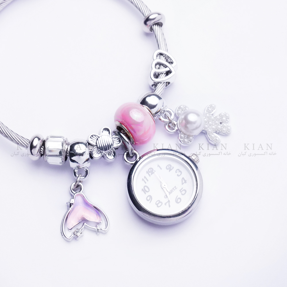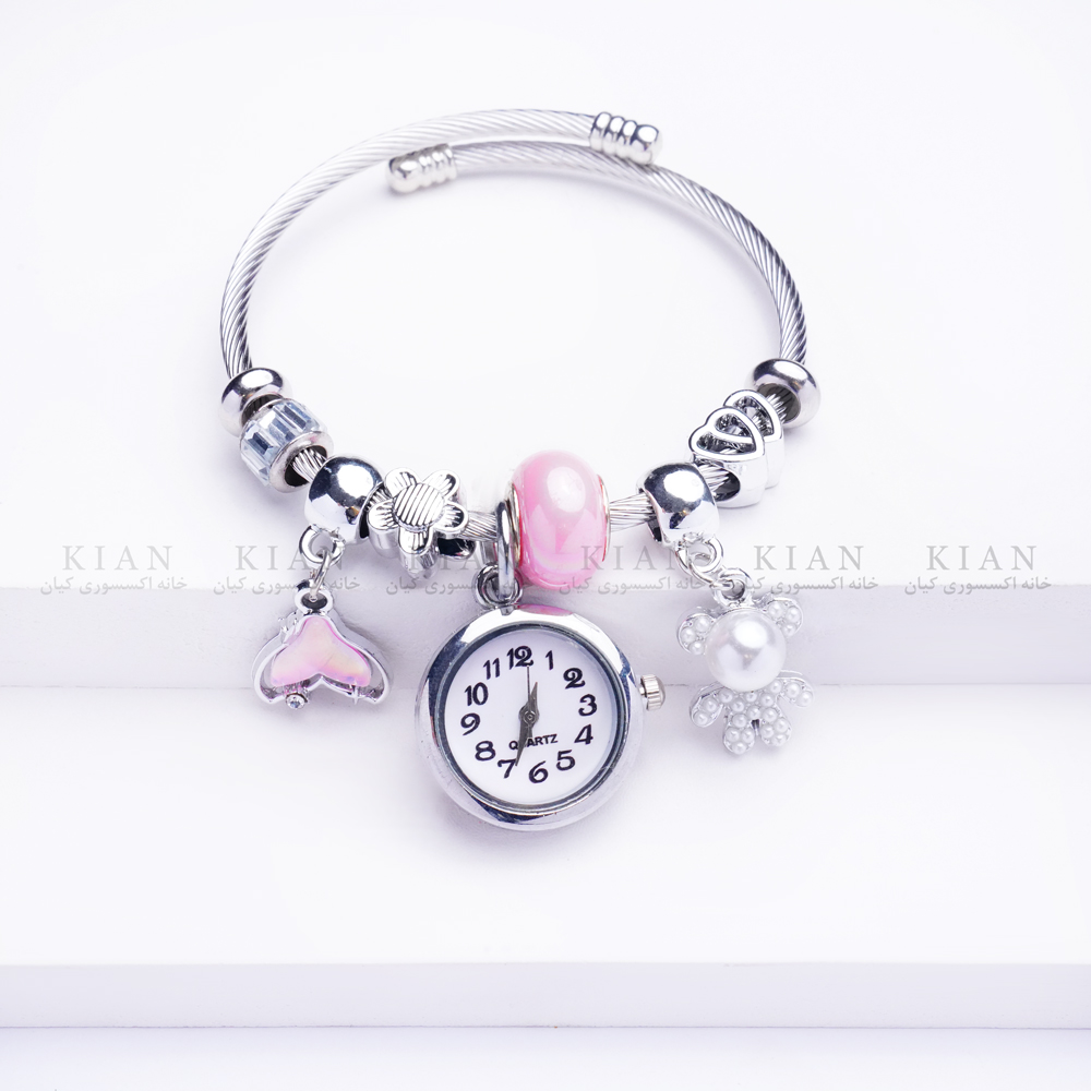 دستبند بنگل ساعت‌دار دم‌وال صورتی یکی از طراحی‌های خاص و دخترانه خانه اکسسوری کیان است. ترکیب رنگ طلایی با صفحه‌ی ساعت صورتی و آویز ظریف دم‌وال، جلوه‌ای فانتزی و شیک ایجاد کرده که برای استایل‌های روزانه و مجلسی بسیار جذاب است. این دستبند انتخابی عالی برای کسانی است که به دنبال اکسسوری‌های خاص، ترندی و متفاوت هستند.