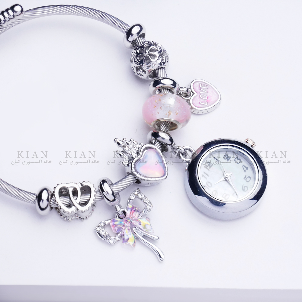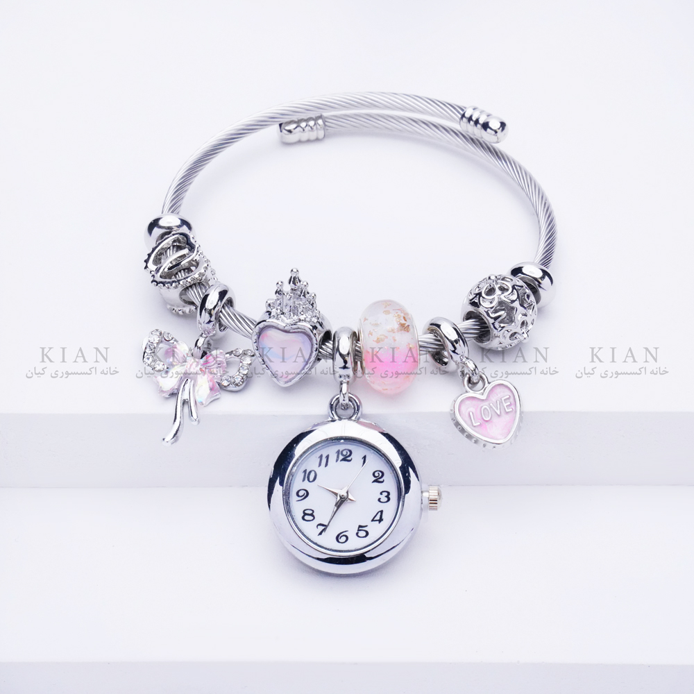 دستبند بنگل ساعتدار قلب و پاپیون با طراحی قلب و پاپیون و ترکیب بند بنگل فلزی و صفحه ساعت شیک، انتخابی مدرن و متفاوت برای استایل های دخترانه است. رنگ صورتی جذاب صفحه جلوه ای خاص و فانتزی ایجاد کرده و این دستبند را به گزینه ای عالی برای استفاده روزمره یا هدیه ای خاص تبدیل می کند. این مدل زیبا و پرطرفدار را می توانید از خانه اکسسوری کیان با کیفیت بالا و قیمت مناسب تهیه کنید.