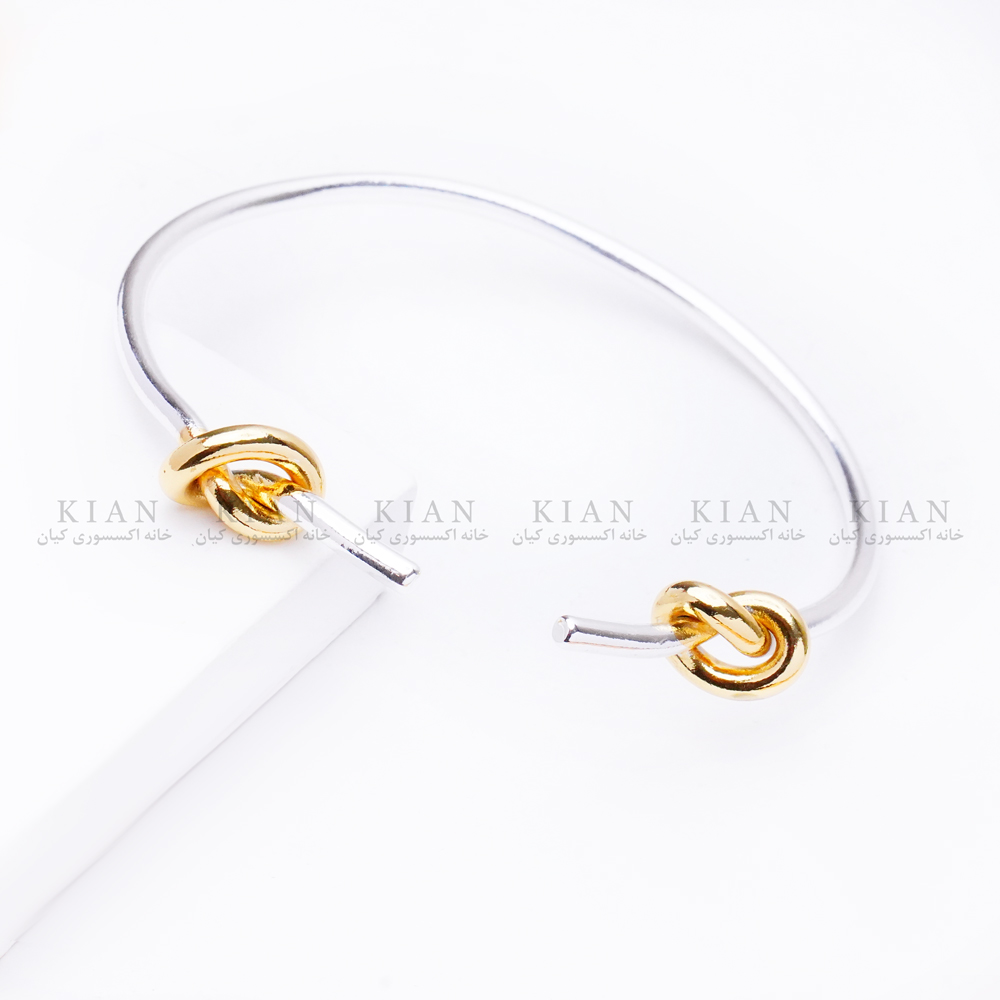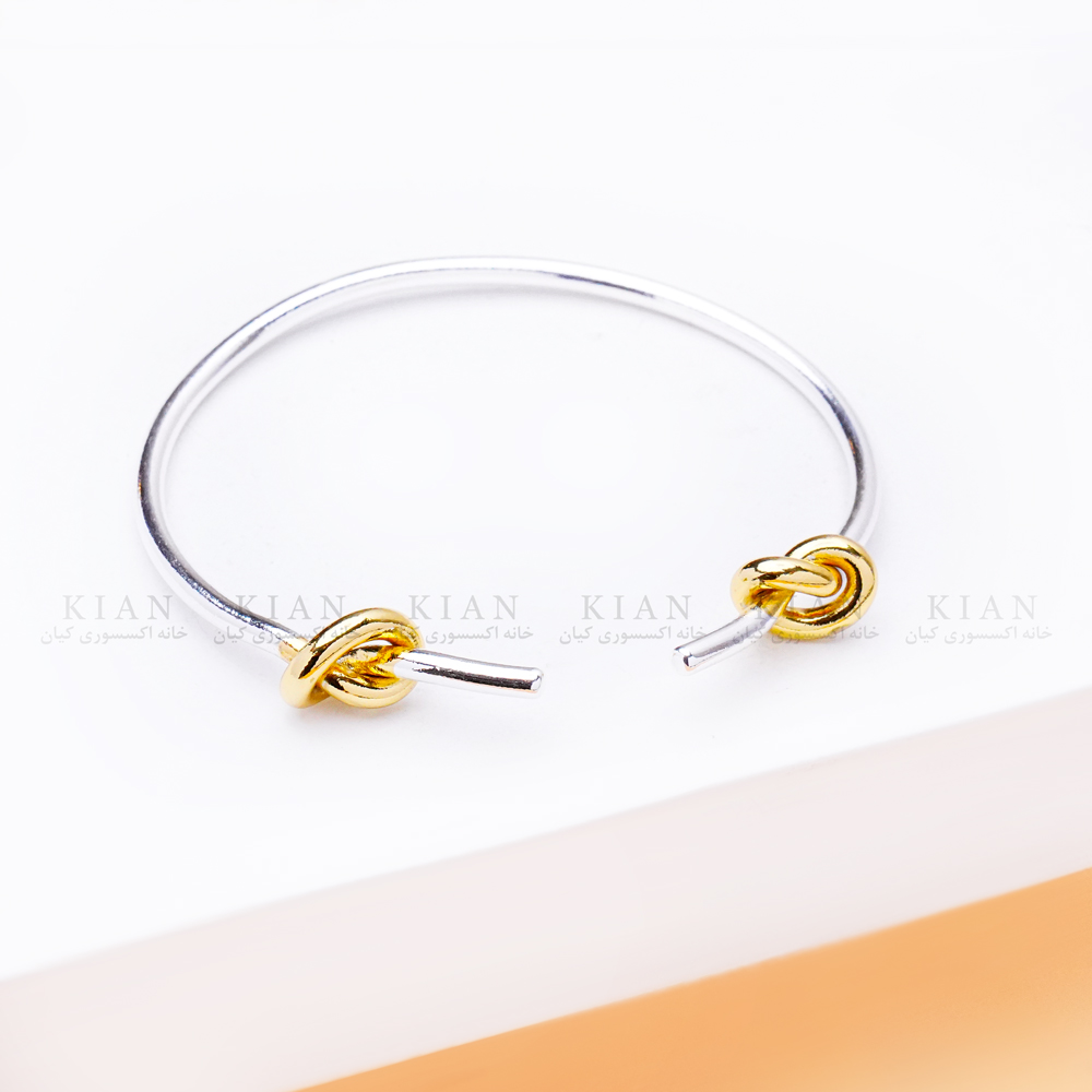 این دستبند با فرم باز و ساده‌ی بنگل ساخته شده و بدنه‌ی آن از فلز سیلور براق تشکیل شده است. دو گره طلایی در دو سر دستبند، نقطه‌ی اصلی زیبایی این مدل هستند؛ گره‌هایی کوچک اما چشمگیر که نماد پیوند، عشق و استحکام نیز به شمار می‌روند. همین تضاد رنگی سیلور و طلایی، دستبند را به گزینه‌ای بسیار خاص و قابل ست شدن با انواع زیورآلات تبدیل کرده است.