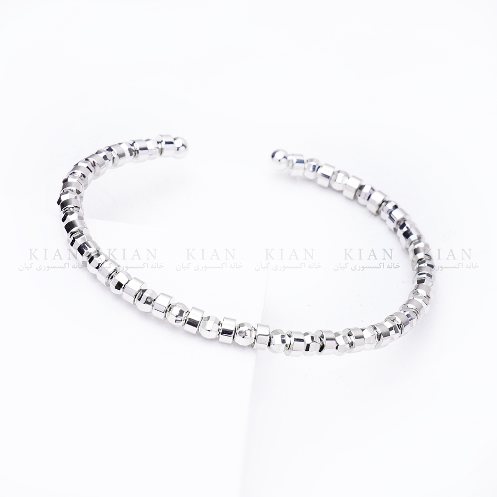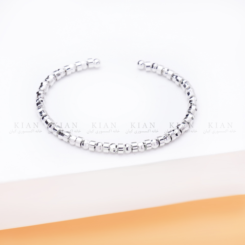 این دستبند با فرم نیمدایرهای باز طراحی شده و سراسر بدنه آن از مهرههای کوچک و مرتب تشکیل شده است. همین بافت مهرهای، جلوهای درخشان و لطیف به دستبند میدهد و آن را برای ست کردن با زیورآلات مینیمال دیگر یا ساعت، به گزینهای عالی تبدیل میکند.