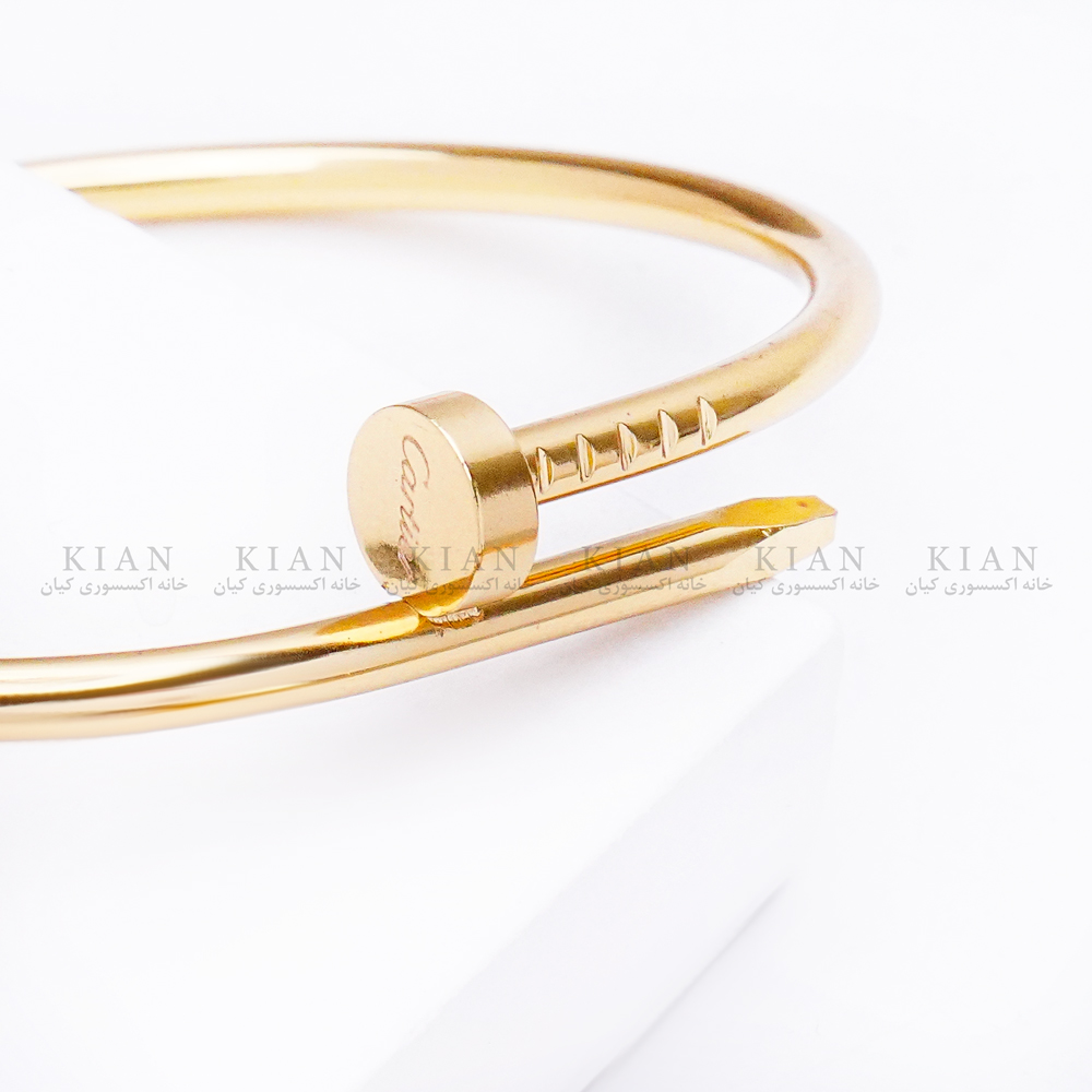 این دستبند با طراحی نیمدایرهای باز ساخته شده و بدنهای درشت، صاف و براق دارد. بخش انتهایی آن بهصورت سر میخی ظریف کار شده که ظاهر دستبند را خاصتر، مدرنتر و متفاوتتر میکند. رنگ طلایی براق این مدل، آن را به انتخابی فوقالعاده برای ست کردن با زیورآلات طلایی و استایلهای مجلسی، مینیمال یا روزمره تبدیل کرده است.