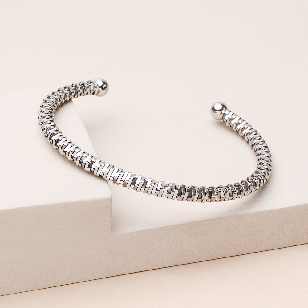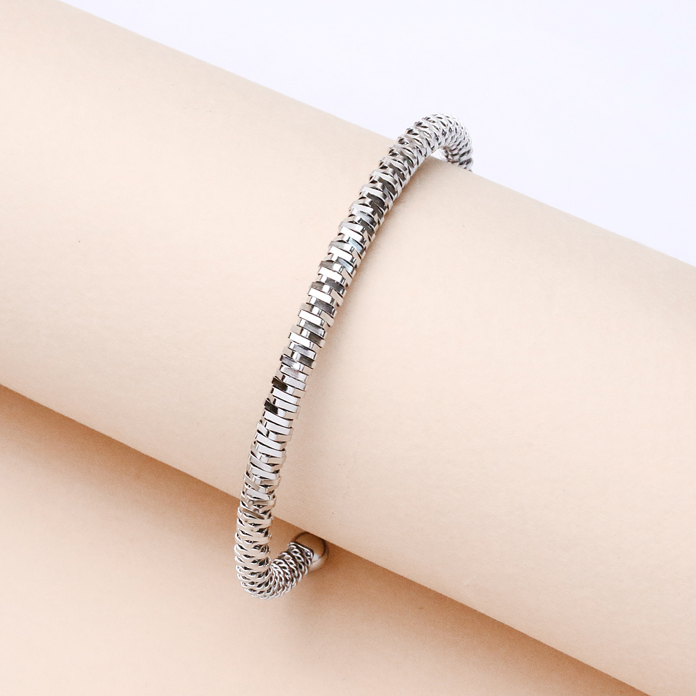 دستبند بنگل فنری نقره ای با طراحی مینیمال و درخشش چشمنواز خود، انتخابی شیک و همیشهمد برای استایلهای روزمره و مجلسی است. فرم بنگل (النگویی) آن در کنار ساختار فنری، باعث میشود بهراحتی روی دست قرار بگیرد و بدون نیاز به قفل، کاملاً فیکس و راحت باشد. رنگ نقره ای براق این مدل جلوهای لوکس و ظریف ایجاد میکند و بهراحتی با ساعت، انگشتر یا سایر زیورآلات ست میشود.