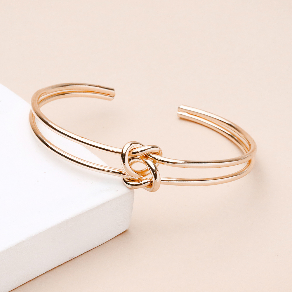 دستبند طلایی دو رینگ گره با طراحی ظریف و الهام‌گرفته از فرم گره، جلوه‌ای شیک و معنا‌دار به استایل شما می‌بخشد. اتصال دو رینگ با جزئیات گره‌ای، حس هماهنگی و ظرافت ایجاد کرده و ظاهر دستبند را خاص و چشم‌نواز می‌کند.