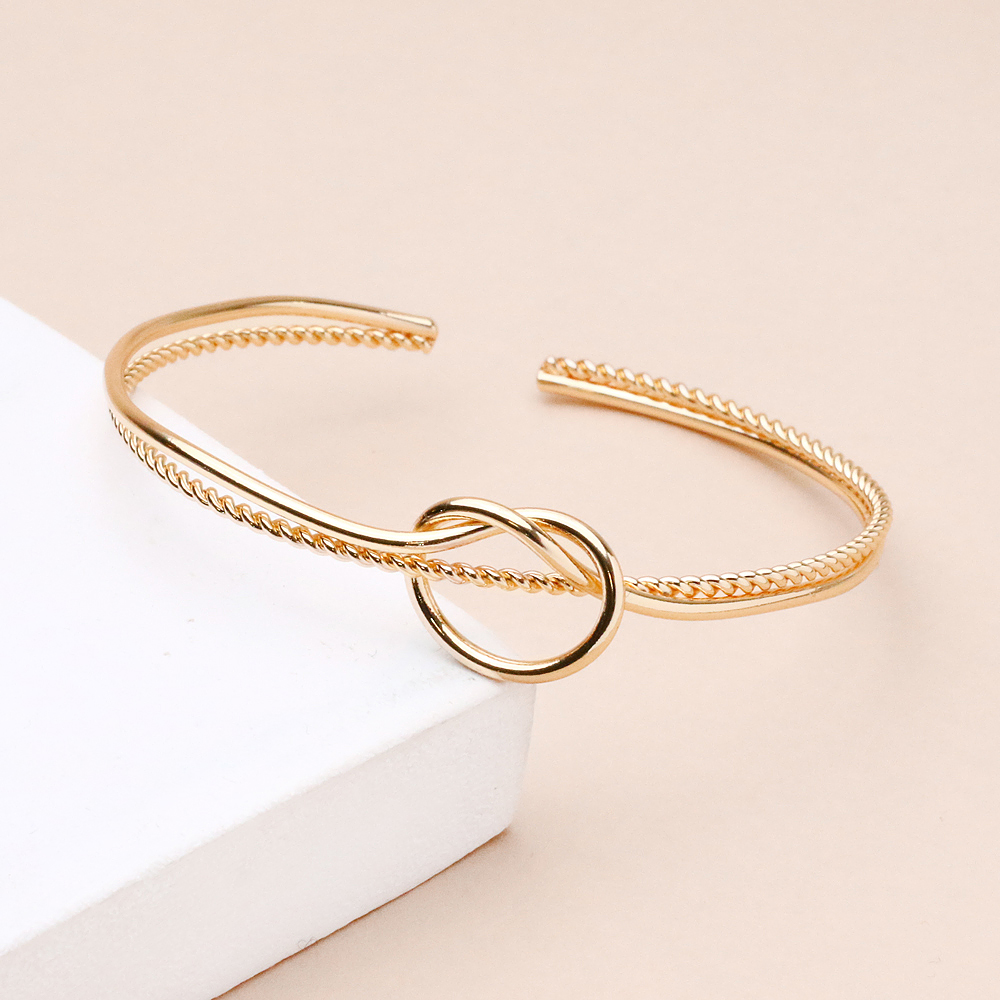 دستبند طلایی گره‌ای با طراحی الهام‌گرفته از فرم گره، جلوه‌ای ظریف و معنا‌دار به استایل شما می‌بخشد. فرم گره‌ای این دستبند نمادی از پیوند و هماهنگی است و در کنار رنگ طلایی براق، ظاهری شیک و چشم‌نواز ایجاد می‌کند.