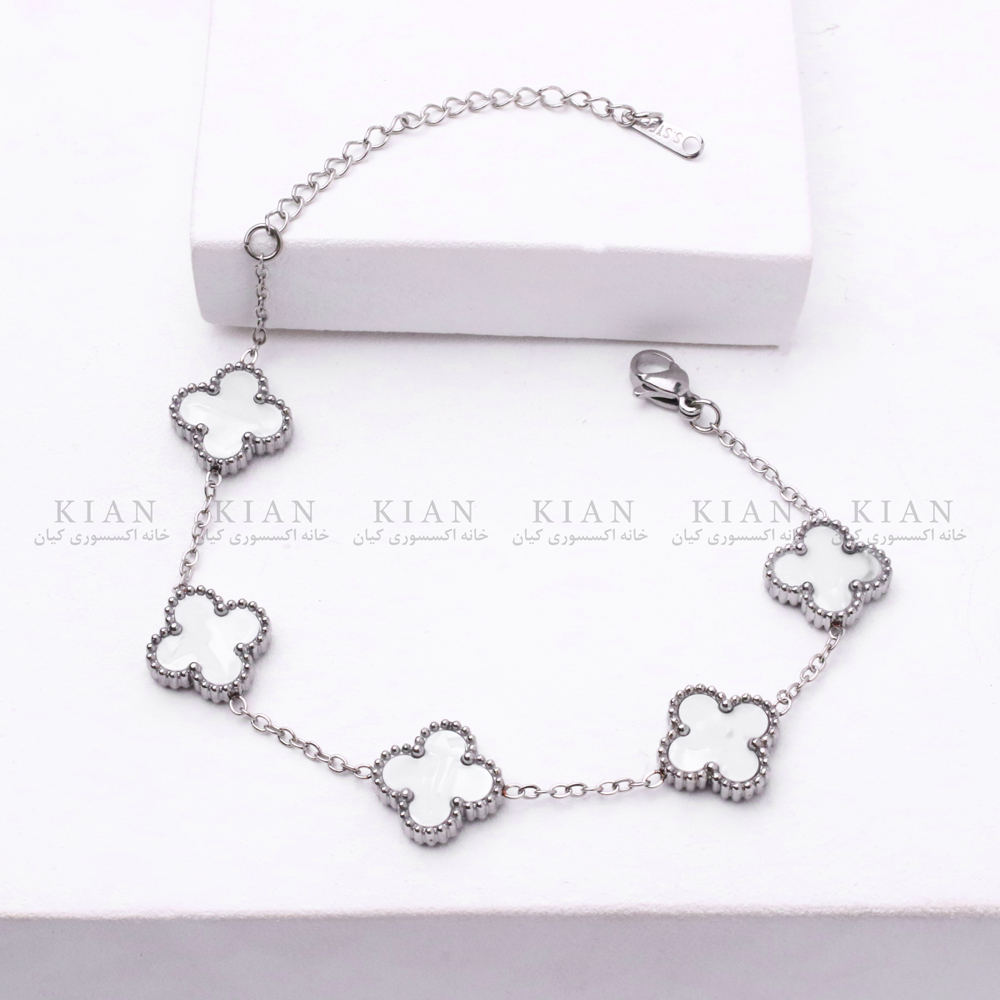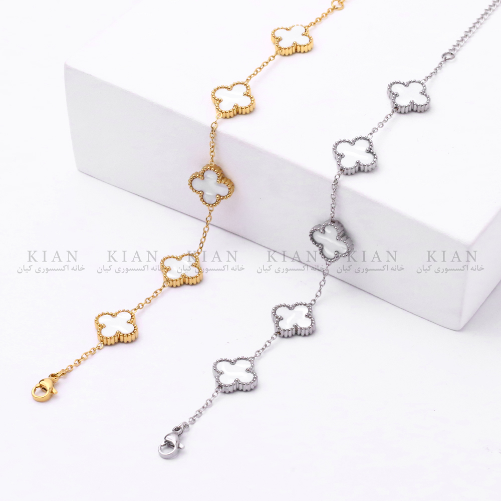 این دستبندها در دو رنگ طلایی و نقره‌ای عرضه می‌شوند و هرکدام با چهاربرگ‌های مینیمال و یک آویز ظریف انتهایی طراحی شده‌اند. فرم یکدست و صیقلی چهاربرگ‌ها، جلوه‌ای بسیار شیک و مرتب روی دست ایجاد می‌کند و حالت کلاسیک مدرن آن‌ها باعث شده همیشه در دنیای فشن محبوب بمانند.