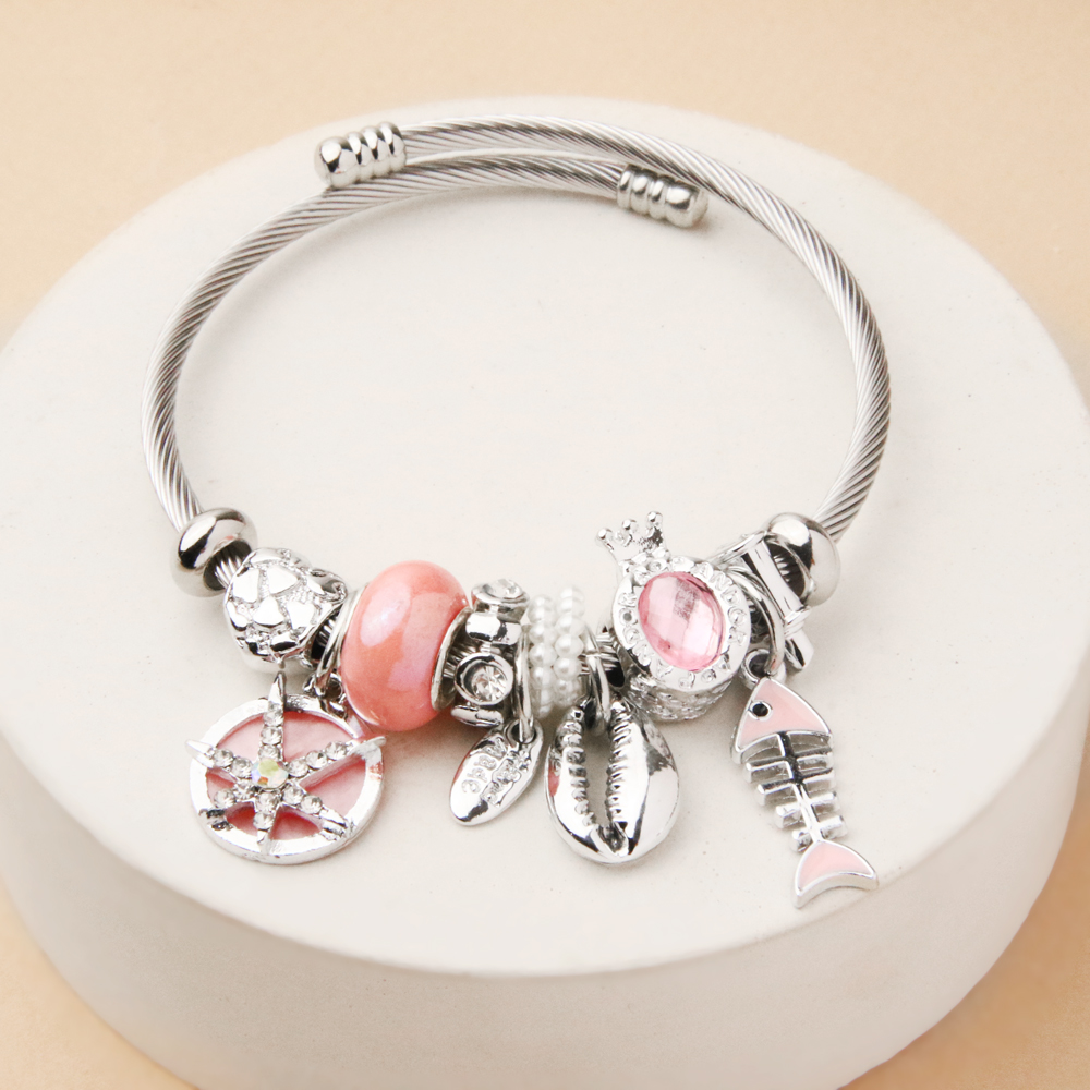 ترکیب رنگ صورتی با فلز براق، این مدل را به انتخابی جذاب برای استایلهای دخترانه، روزمره و هدیهدادن تبدیل کرده است. طراحی کلاسیک دستبند پاندورا باعث میشود بهراحتی با سایر زیورآلات ست شود و همیشه قابل استفاده باشد.