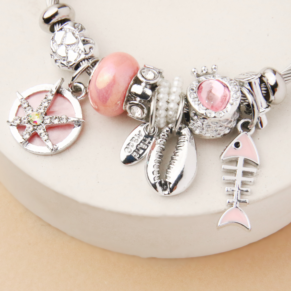 دستبند پاندورا تیغ ماهی صورتی یکی از مدلهای خاص و فانتزی خانه اکسسوری کیان است که با آویز ظریف تیغ ماهی به رنگ صورتی ملایم، حس لطافت و استایلی متفاوت را به دستان شما میبخشد. در کنار این آویز، مهرههای فلزی براق و جزئیات نقرهایرنگ بهکار رفتهاند که جلوهای شیک و متعادل به دستبند دادهاند.