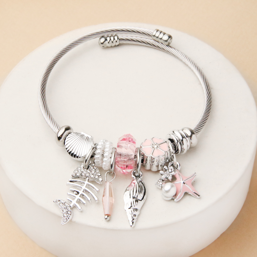 دستبند پاندورا تیغ ماهی و صدف از طراحیهای خاص و الهامگرفته از دنیای دریا در خانه اکسسوری کیان است. در این مدل، آویز ظریف تیغ ماهی در کنار آویز صدف و مهرههای هماهنگ با رنگهای ملایم صورتی و نقرهای قرار گرفتهاند که ترکیبی لطیف، دخترانه و چشمنواز ایجاد میکند.