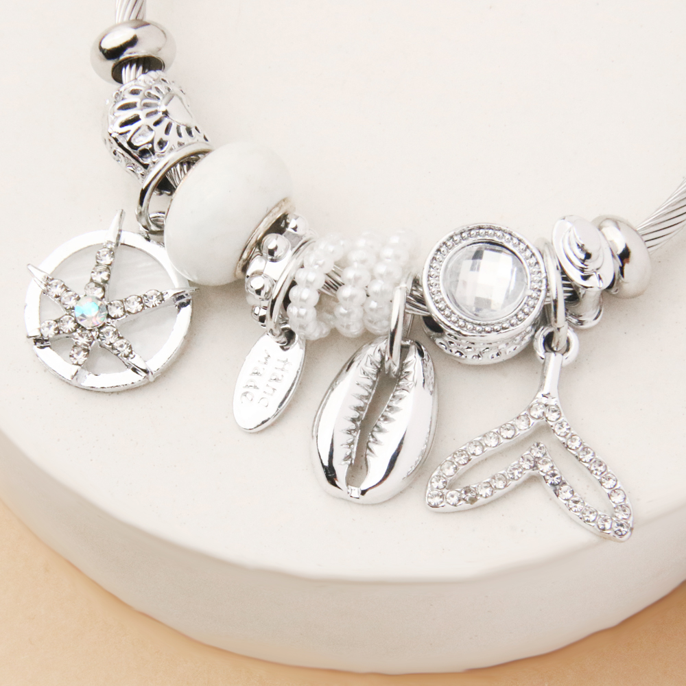 دستبند پاندورا صدف ستارهای از طراحیهای لطیف و الهامگرفته از دنیای دریاست که توسط خانه اکسسوری کیان با دقت انتخاب شده است. در این مدل، آویز صدف با جزئیات ستارهای در کنار مهرهها و آویزهای نقرهایرنگ براق قرار گرفتهاند و ترکیبی آرامشبخش و چشمنواز ایجاد کردهاند.
