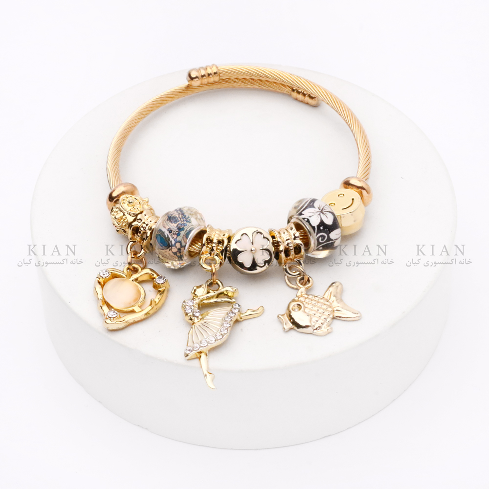 این دستبند از یک فریم طلایی براق و مقاوم ساخته شده و روی آن ترکیبی جذاب از مهرههای نقرهای–طلایی، نگیندار و طرحدار قرار دارد. نقطه اصلی این مدل، آویز فرشتهی رقصان است که با طراحی لطیف و جزئیات ظریف، حس آرامش و زیبایی را به استایل شما اضافه میکند. در کنار آن، دو آویز قلب طلایی نگیندار قرار گرفتهاند که جلوهای عاشقانه و دخترانه ایجاد میکنند.