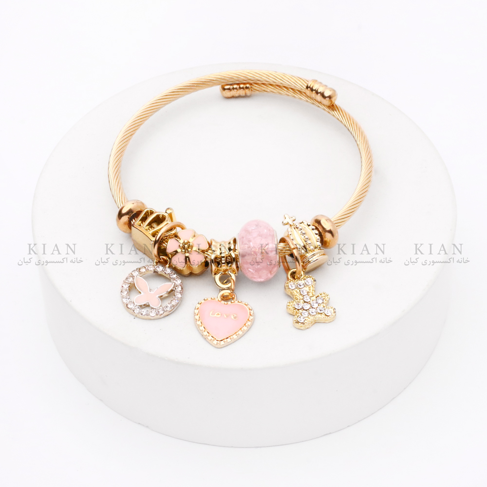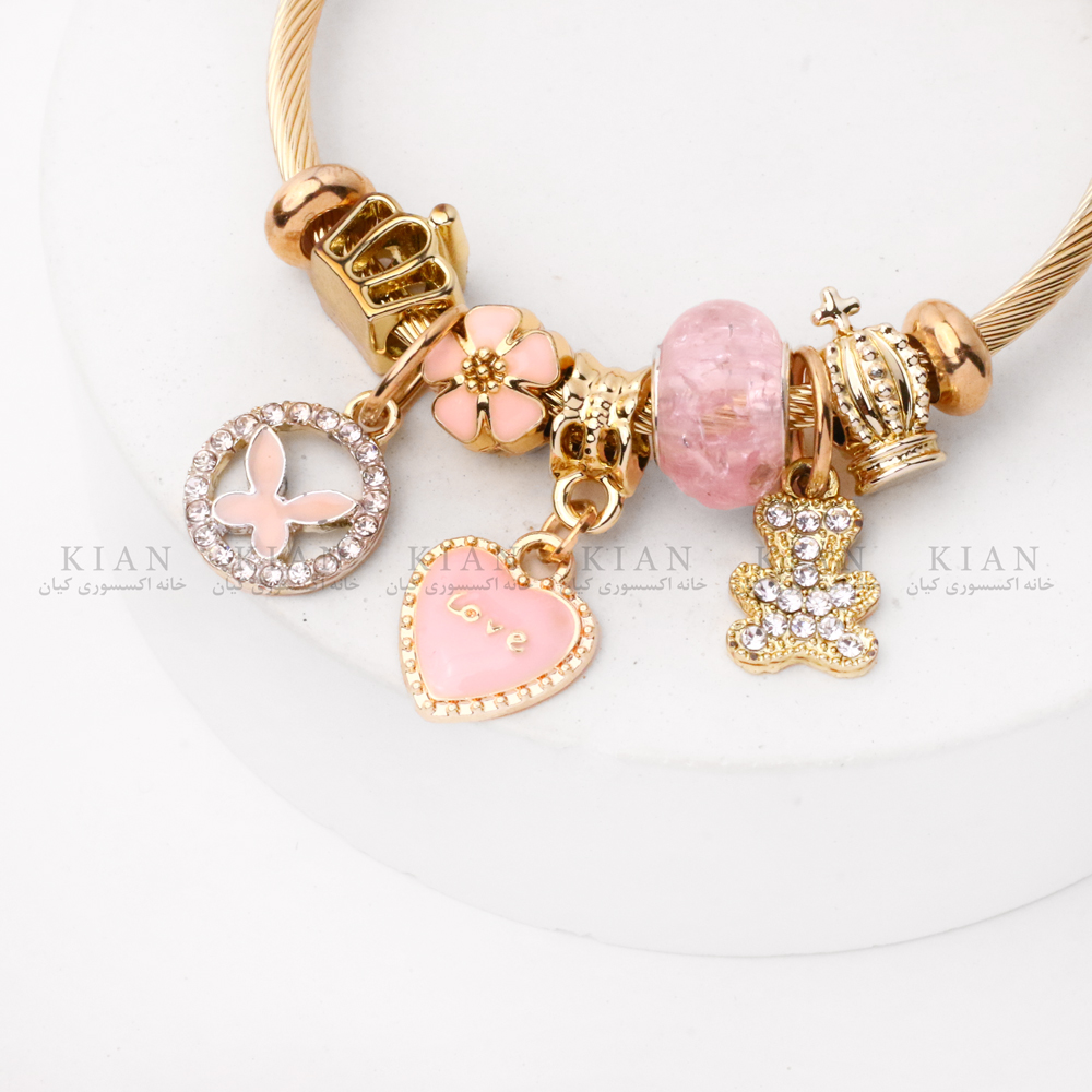 دستبند پاندورا طلایی قلب LOVE یک مدل شیک و رمانتیک است که با ترکیب رنگ صورتی و طلایی، استایلی لطیف و دخترانه میسازد. آویز اصلی آن قلب صورتی LOVE است که بههمراه پلاک نگیندار طرح گل و آویز مستطیلی طلایی زیبایی این مدل را کامل میکند. مهرههای صورتی و طلایی نیز جلوهای درخشان و جذاب به دستبند میبخشند.