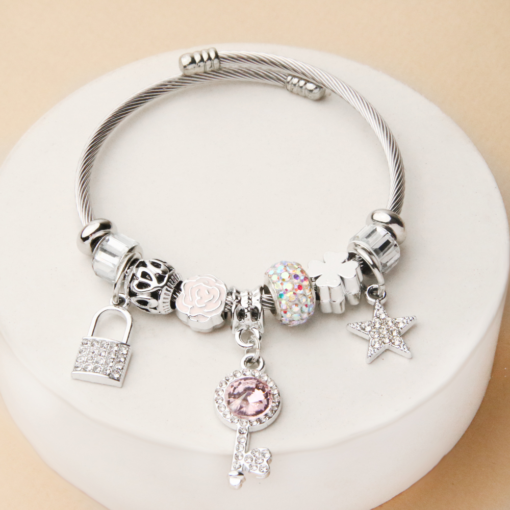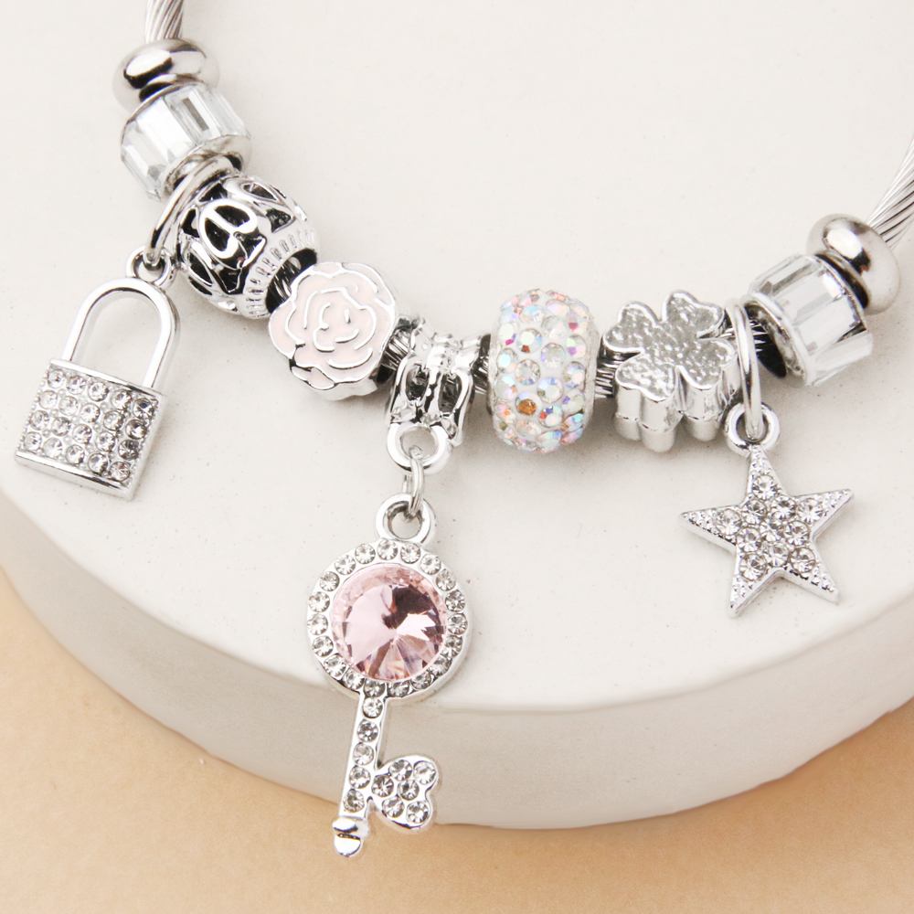 دستبند پاندورا قفل و کلید نگیندار از مدلهای ظریف و معنادار خانه اکسسوری کیان است که با آویز قفل و کلید مزین به نگینهای درخشان، نمادی از عشق، اعتماد و رازهای قلبی را به زیبایی نمایش میدهد. در کنار این آویزها، مهرهها و جزئیات نقرهایرنگ براق قرار گرفتهاند که جلوهای شیک و متعادل به دستبند میبخشند.