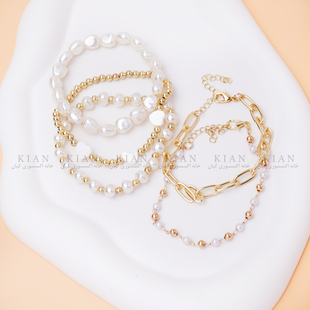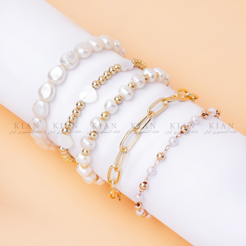 پک دستبند سنگ طلایی از کالکشن خاص و درخشان خانه اکسسوری کیان، ترکیبی از ظرافت و درخشش است که استایل شما را لوکس و چشم‌گیر می‌سازد. این مجموعه شامل چند دستبند متنوع با مهره‌های سنگی براق، مرواریدهای سفید و زنجیرهای طلایی ظریف است که هم به‌صورت تکی و هم ترکیبی جلوه‌ای فوق‌العاده دارند.