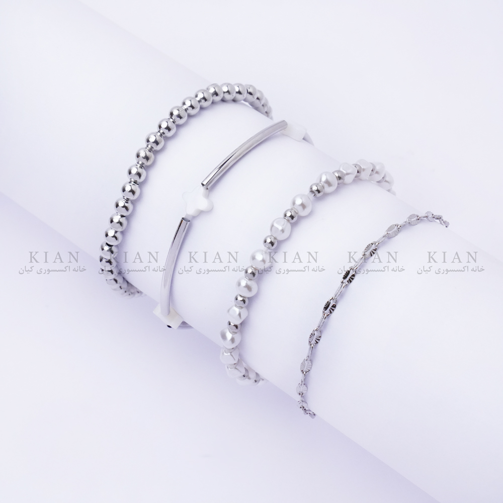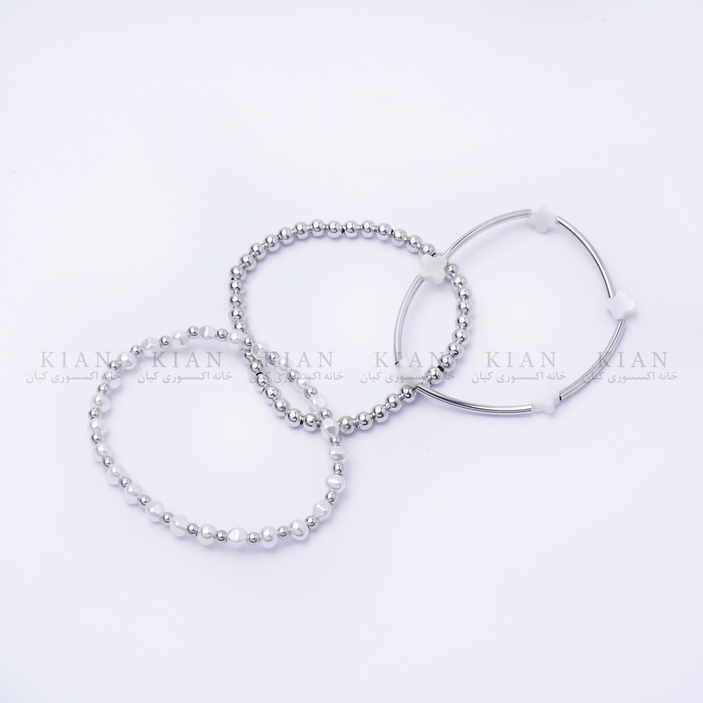 پک دستبند نقرهای ساچمهای از مجموعه زیورآلات خاص خانه اکسسوری کیان، تلفیقی از سادگی، ظرافت و درخشش است. این ست شامل چند دستبند ظریف نقرهای با مهرههای ساچمهای براق است که در کنار هم جلوهای هماهنگ، شیک و زنانه ایجاد میکنند.