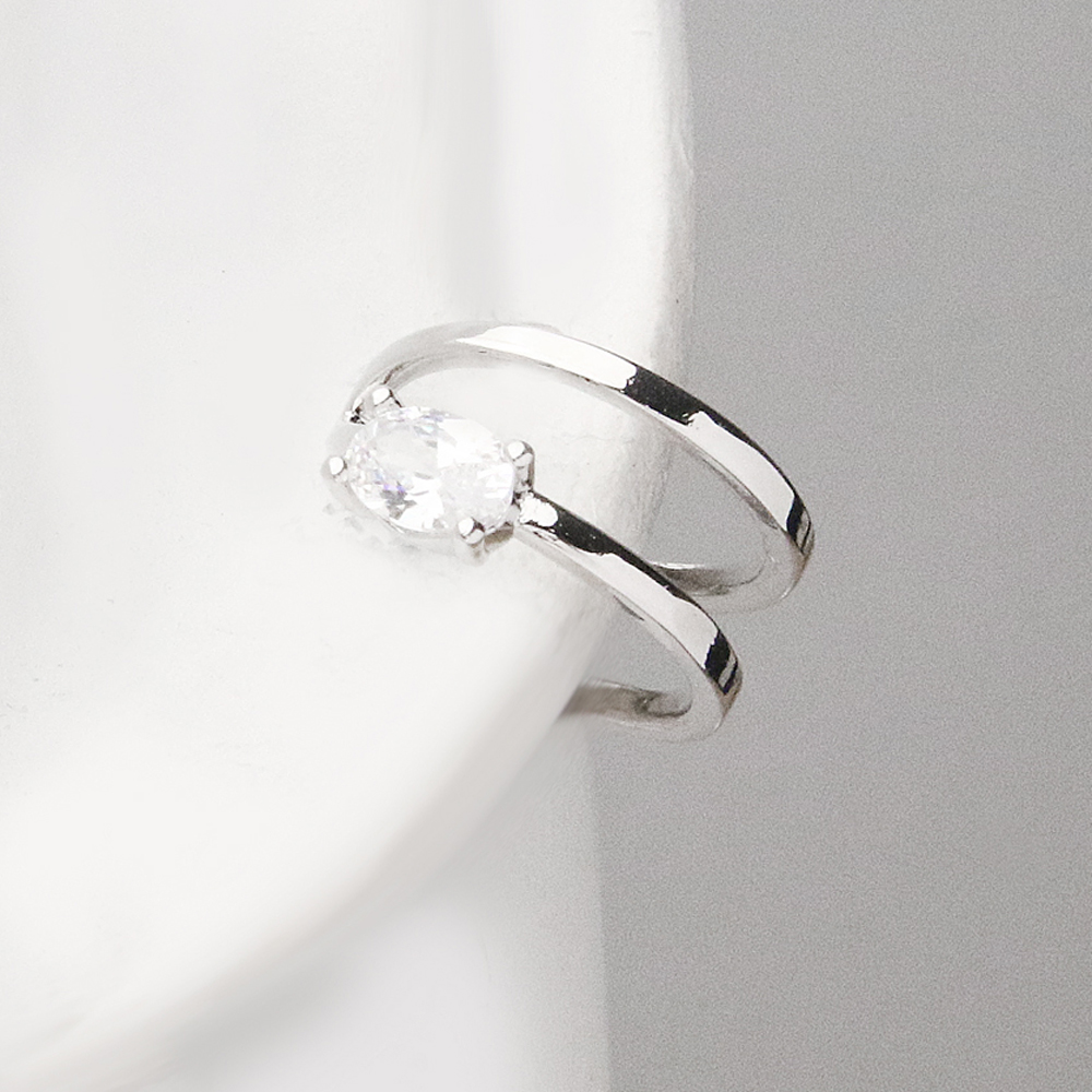 این ایرکاف با طراحی باز و فرم موجی ساخته شده و در بالاترین بخش خود، یک تکنگین براق قرار دارد که با کوچکترین حرکت، جلوهای درخشان و چشمگیر ایجاد میکند. بدنه نقرهای براق آن، حالتی بسیار تمیز و امروزی دارد و همین باعث میشود با هر مدل گوشواره یا استایل روزانه بهخوبی ست شود.