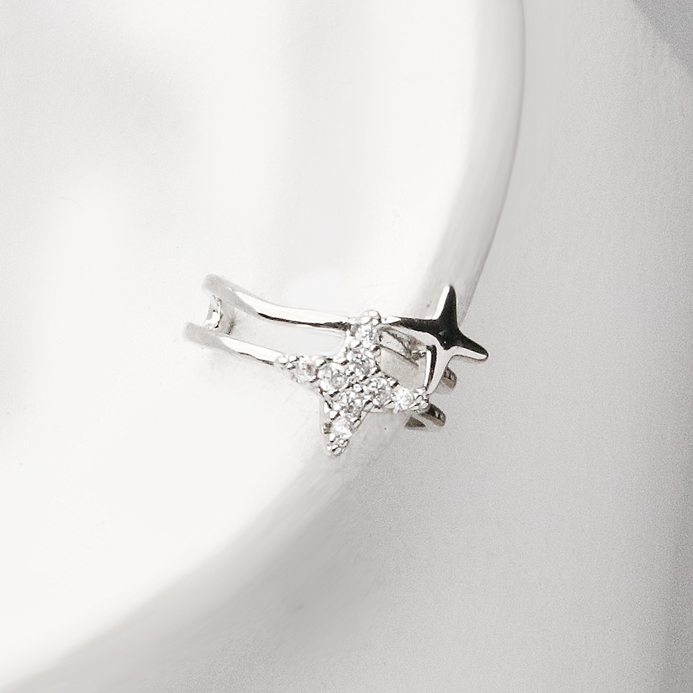 این ایرکاف با طراحی باز و فرم ستاره ای ساخته شده و جلوهای درخشان و چشمگیر ایجاد میکند. بدنه نقرهای براق آن، حالتی بسیار تمیز و امروزی دارد و همین باعث میشود با هر مدل گوشواره یا استایل روزانه بهخوبی ست شود.
