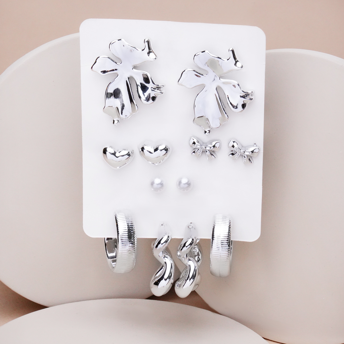 در این پک چند مدل گوشواره متنوع قرار دارد که هرکدام برای موقعیتهای متفاوتی مانند استفاده روزمره، مهمانی یا استایلهای رسمی مناسب هستند. سطح براق نقره ای و جزئیات دقیق، جلوهای زنانه و لطیف به چهره میدهد.