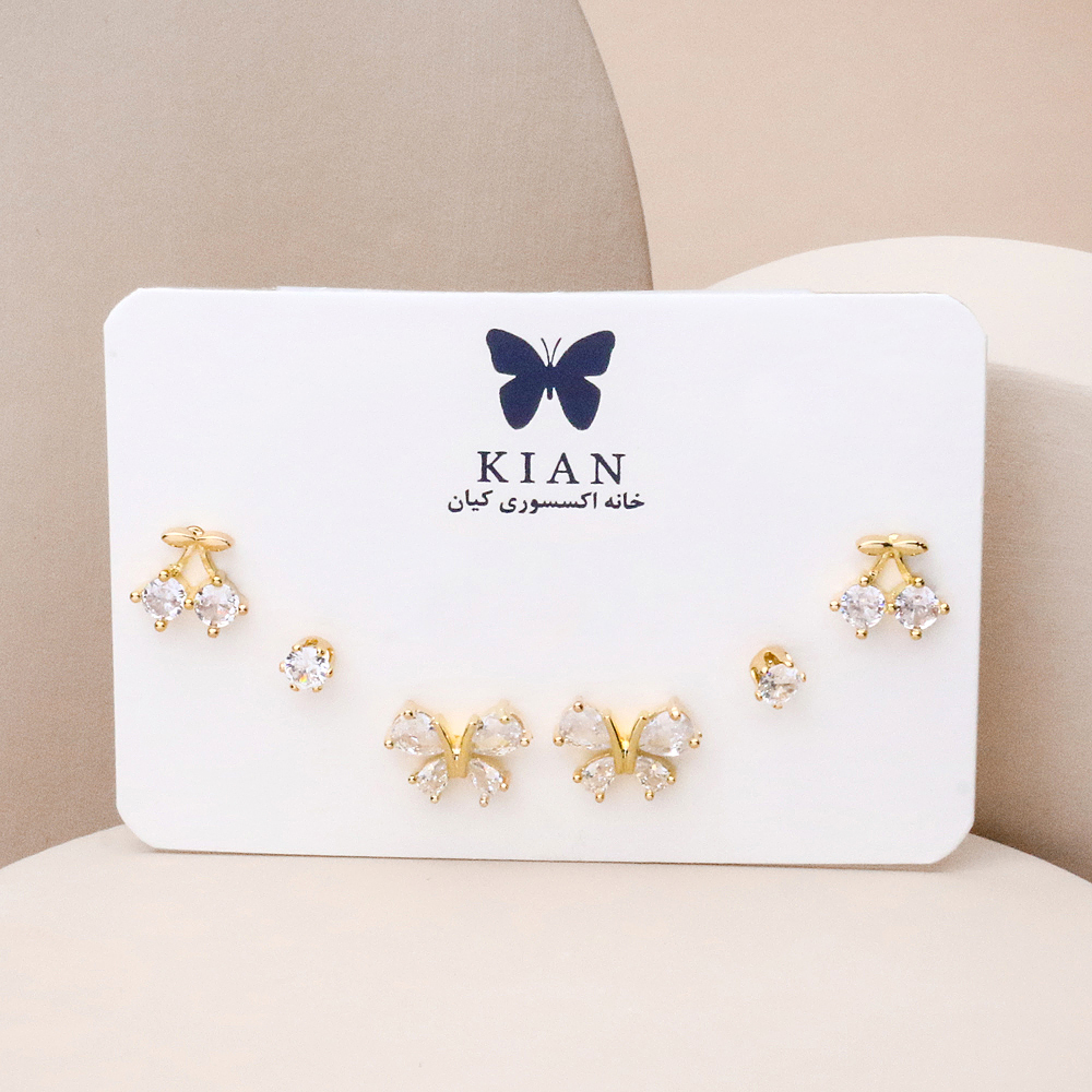 پک گوشواره گیلاس و پاپیون نگین‌دار طلایی با طراحی فانتزی و درخشش ظریف نگین‌ها، انتخابی شاد و چشم‌نواز برای استایل‌های دخترانه است. ترکیب گیلاس‌های دوست‌داشتنی با پاپیون‌های ظریف و رنگ طلایی براق، جلوه‌ای خاص و جذاب به چهره می‌بخشد و برای استفاده روزمره یا مهمانی گزینه‌ای ایده‌آل است. این مدل در خانه اکسسوری کیان با دقت در انتخاب طرح و کیفیت ارائه شده تا زیبایی را متفاوت تجربه کنید.