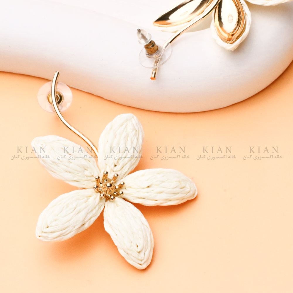 این گوشواره از الیاف حصیری سبک ساخته شده که در قالب گل پنج‌پر طراحی شده و جلوه‌ای طبیعی، هنری و بسیار دلنشین دارد. مرکز گل با یک هسته طلایی براق تزئین شده که ترکیب حصیر و فلز را کاملاً چشمگیر و هماهنگ کرده است. آویز بودن این گوشواره باعث می‌شود حرکت زیبایی داشته باشد و روی صورت جلوه‌ای دخترانه و بسیار جذاب ایجاد کند.