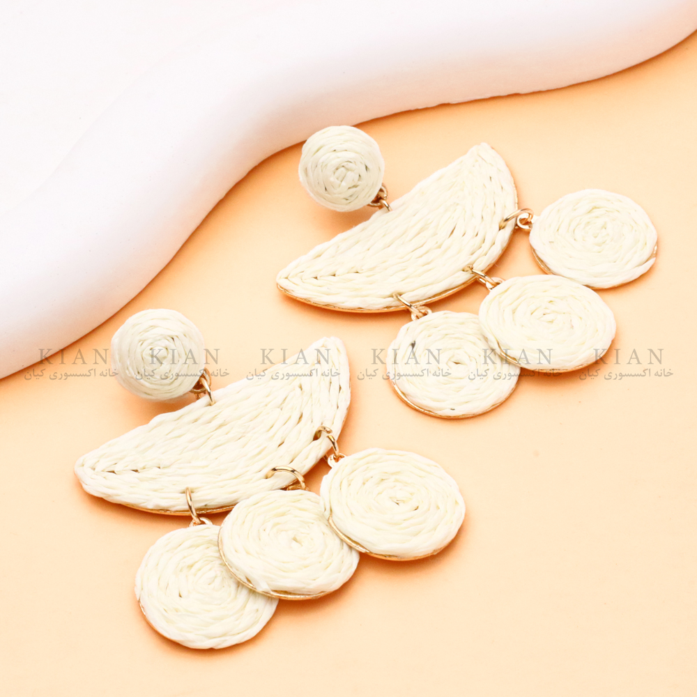 بخش بالایی این گوشواره از یک نیمدایره حصیری با بافت منظم ساخته شده و در بخش پایین آن چند دایره حصیری کوچک بهصورت آویزی قرار گرفتهاند که با حرکت سر، جلوهای بسیار زیبا و دخترانه ایجاد میکنند. این ترکیب هندسی باعث میشود گوشواره روی صورت بسیار متعادل، لطیف و جذاب دیده شود.