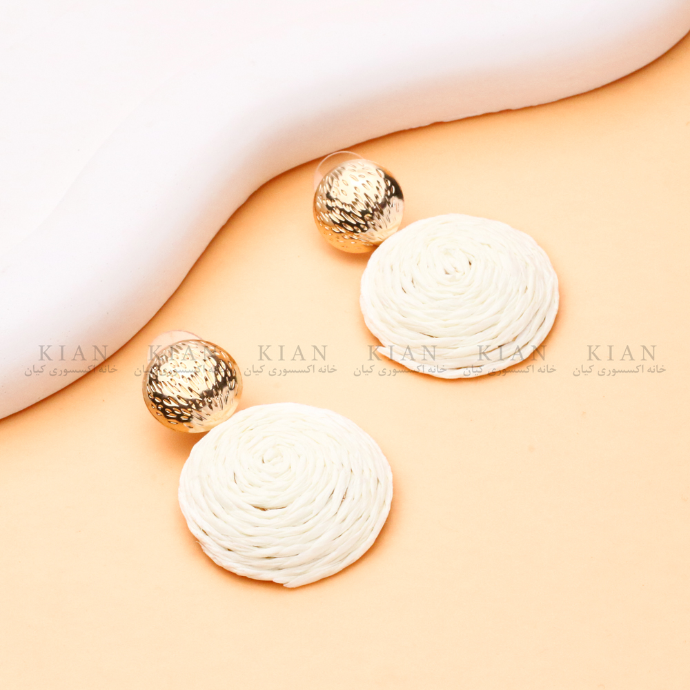 بخش آویزی این گوشواره از الیاف حصیری به شکل دایرهای تخت با بافت منظم ساخته شده که ظاهری شبیه یک کلاه کوچک حصیری را تداعی میکند. رنگ روشن و جذاب این بافت، حس و حال تمیزی و نو بودن را منتقل کرده و جلوهای چشمگیر به استایل میبخشد. بخش بالایی گوشواره نیز یک دکمه طلایی براق است که تضاد زیبایی با رنگ حصیر ایجاد کرده و ظاهر اکسسوری را لوکستر میکند.