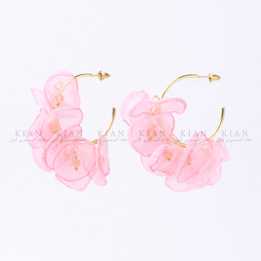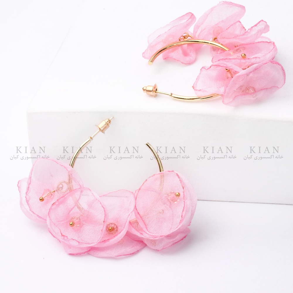 گوشواره حلقه ای تمام گل صورتی مدلی رمانتیک و ظریف است که با حلقه طلایی باریک و گل‌های پارچه‌ای صورتی، جلوه‌ای لطیف، دخترانه و بسیار چشمگیر ایجاد می‌کند. چین‌خوردگی نرم گل‌ها روی حلقه، این مدل را به انتخابی عالی برای استایل‌های تابستانی، مهمانی‌های شیک و حتی استایل‌های عروسی تبدیل کرده است.