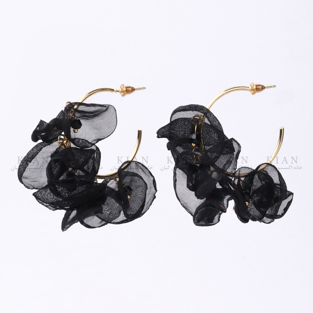 گوشواره حلقه ای تمام گل مشکی مدلی رمانتیک و ظریف است که با حلقه طلایی باریک و گل‌های پارچه‌ای مشکی، جلوه‌ای لطیف، دخترانه و بسیار چشمگیر ایجاد می‌کند. چین‌خوردگی نرم گل‌ها روی حلقه، این مدل را به انتخابی عالی برای استایل‌های تابستانی، مهمانی‌های شیک و حتی استایل‌های عروسی تبدیل کرده است.