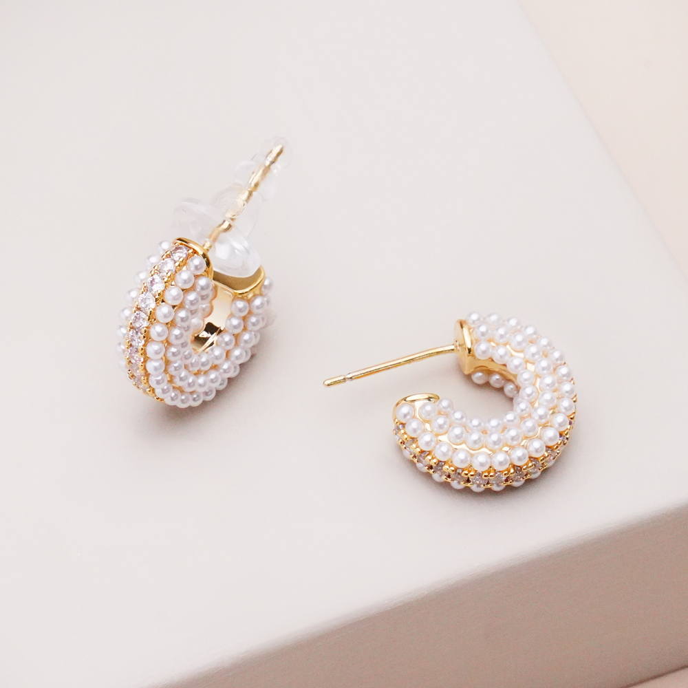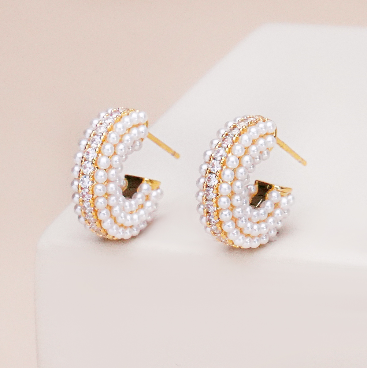 گوشواره نیم دایره مرواریدی طلایی با طراحی ظریف و مدرن، ترکیبی زیبا از فرم هندسی و لطافت مروارید را ارائه میدهد. قاب نیمدایره طلایی براق در کنار مرواریدهای درخشان، جلوهای شیک و متعادل ایجاد کرده که بهخوبی روی گوش مینشیند و ظاهری مرتب و چشمنواز میسازد.