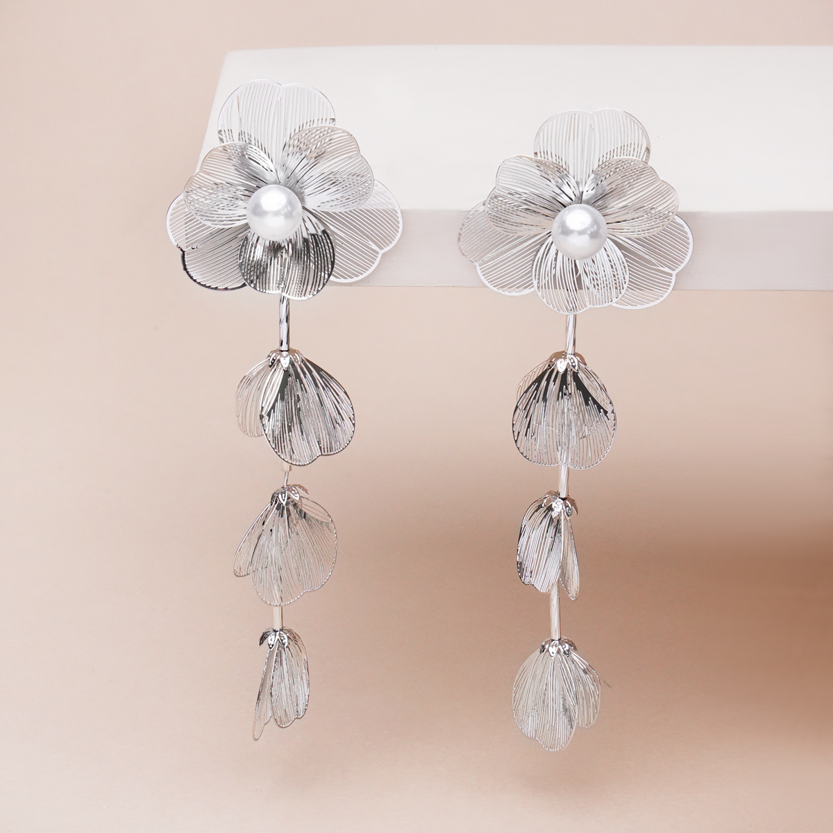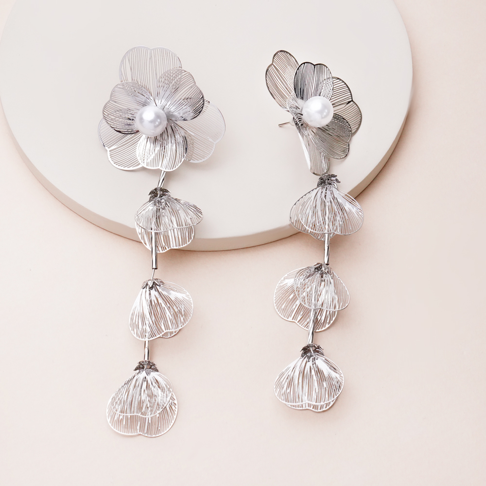 گوشواره گل آویزی توری نقرهای، این گوشوارههای بلند و خیرهکننده از خانه اکسسوری کیان، تجسمی از ظرافت یخی و درخشش مهتابی هستند. طراحی خلاقانه این کار با یک گل توریِ مشبک در قسمت لاله گوش آغاز میشود که بافتی نرم و هنرمندانه دارد. آویزهای متوالی از گلبرگهای نقرهای که با زنجیری ظریف به هم متصل شدهاند، با هر حرکت شما رقص نوری تماشایی ایجاد کرده و حسی از سبکی و معلق بودن را القا میکنند.