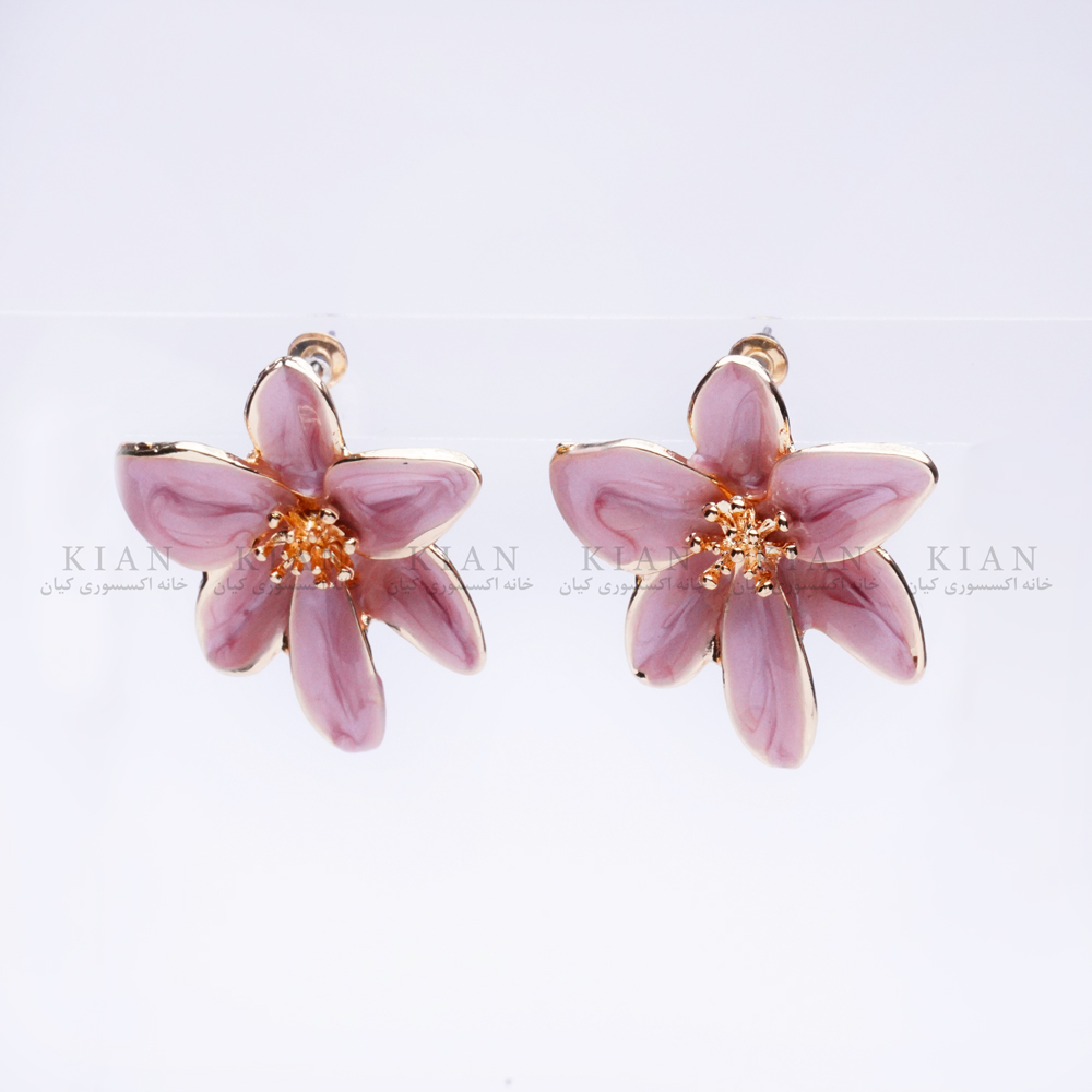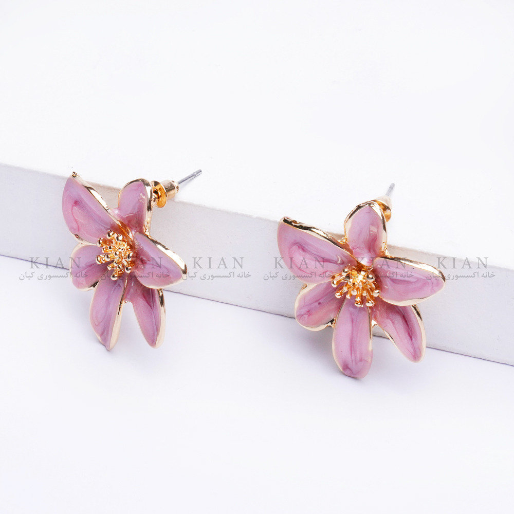 گوشواره گل صورتی براق از مجموعه ی خاص خانه اکسسوری کیان، ترکیبی شیک از رنگ صورتی براق و طلایی در طراحی ای منحصر به فرد و چشم گیر است.