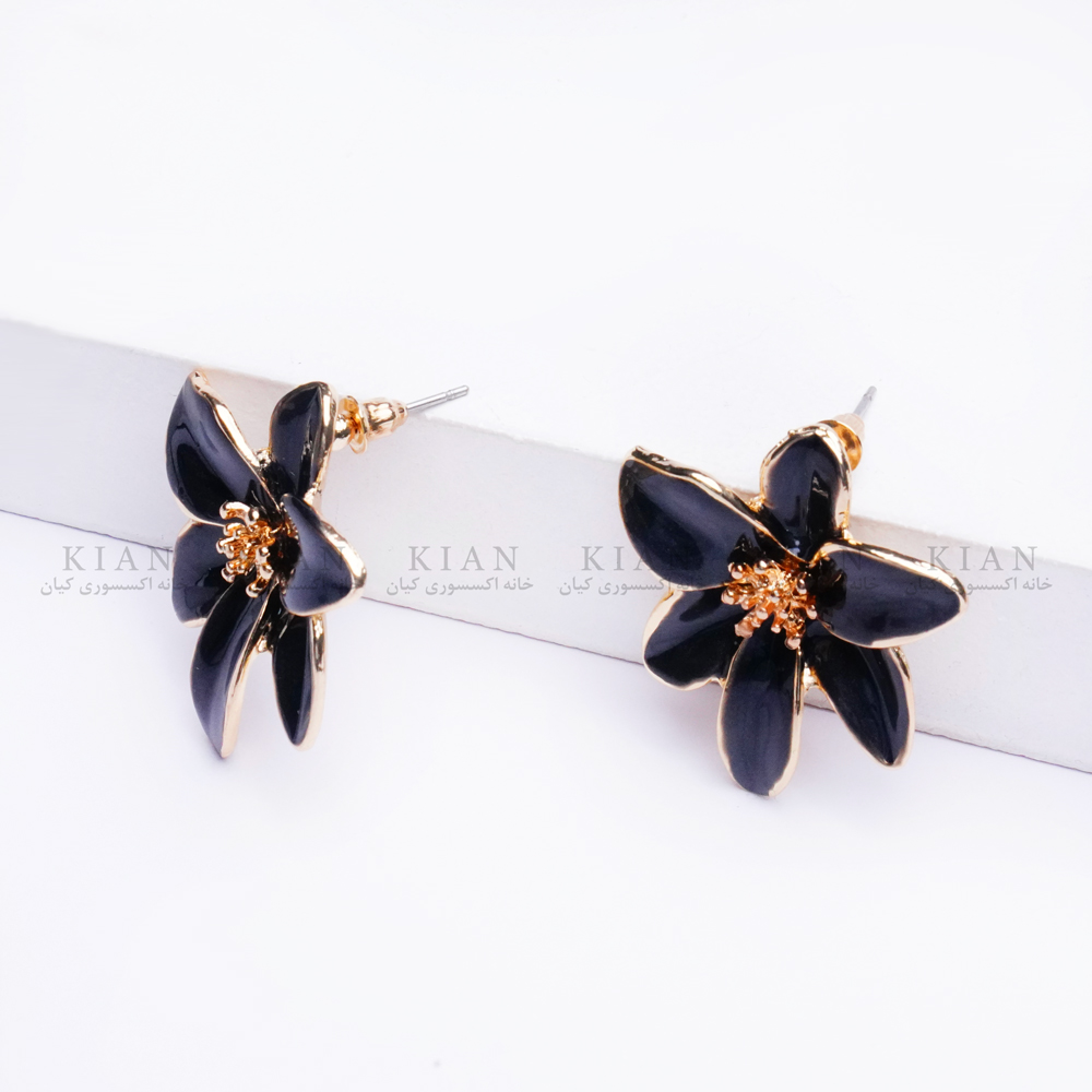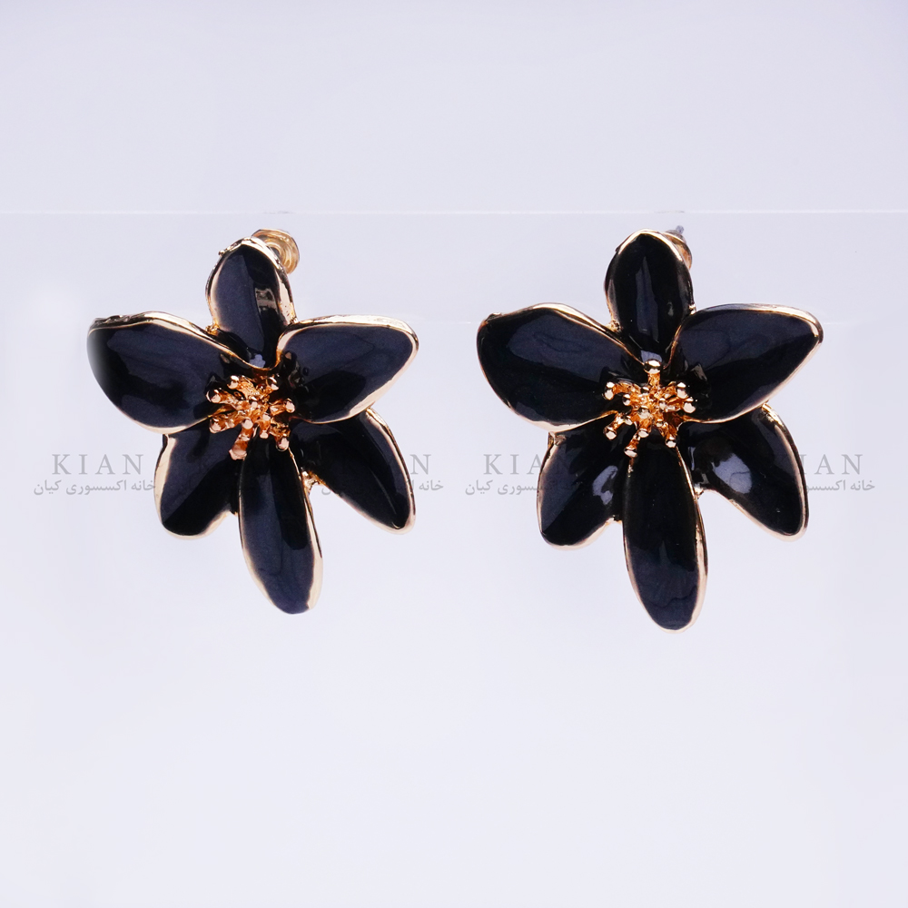 گوشواره گل مشکی براق از مجموعه ی خاص خانه اکسسوری کیان، ترکیبی شیک از رنگ مشکی براق و طلایی در طراحی ای منحصر به فرد و چشم گیر است.