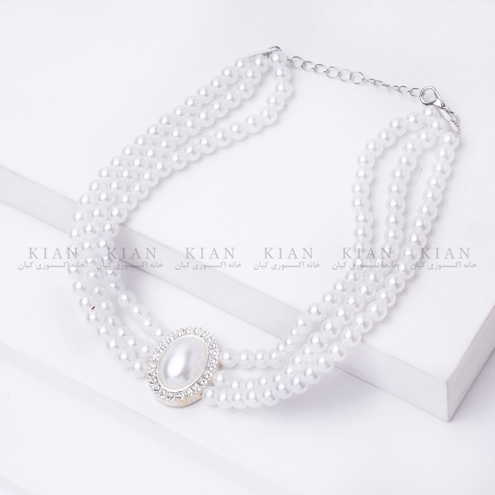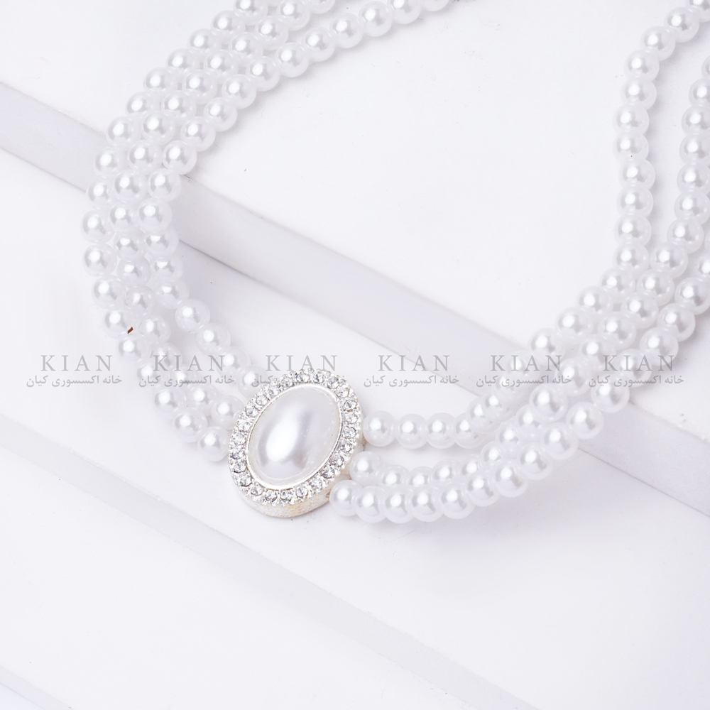 چوکر مرواریدی نقره ای یک مدل شیک، مجلسی و فوقالعاده چشمگیر است که با سه ردیف مروارید سفید براق و یک قاب نقره ای نگیندار با مروارید مرکزی جلوهای لوکس و زنانه ایجاد میکند. این طراحی کلاسیک، گردن را بسیار زیبا و ظریف نشان میدهد.