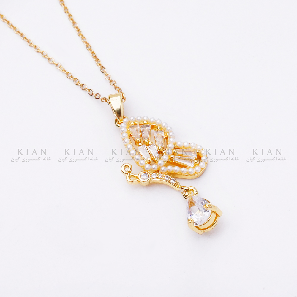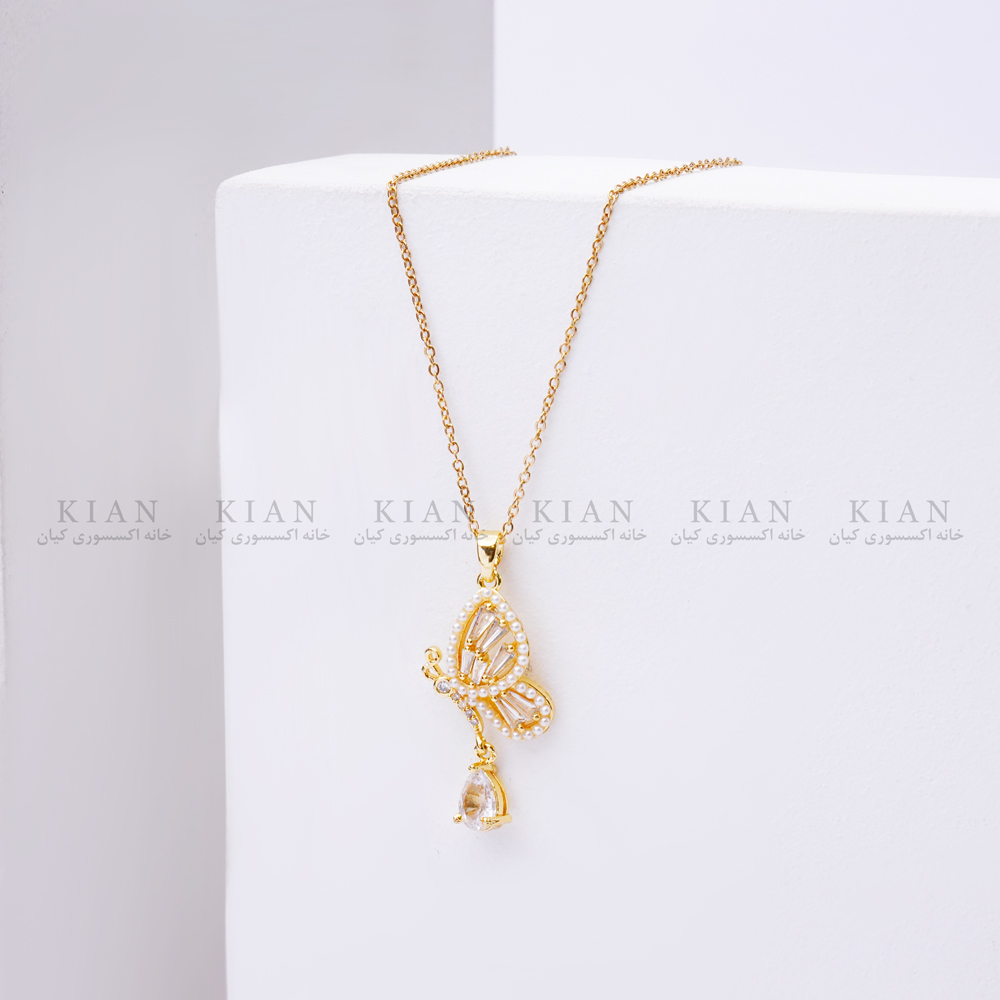 پلاک این گردنبند به شکل یک بال پروانهی ظریف طراحی شده که با نگینهای ریز و درخشان پوشیده شده است. این نگینها با کوچکترین حرکت یا برخورد نور، برق ملایمی ایجاد میکنند و گردنبند را بسیار جذاب و پرجلوه نشان میدهند. در انتهای بال نیز یک آویز کوچک نگیندار قرار دارد که مدل را زنانهتر و خاصتر میکند.