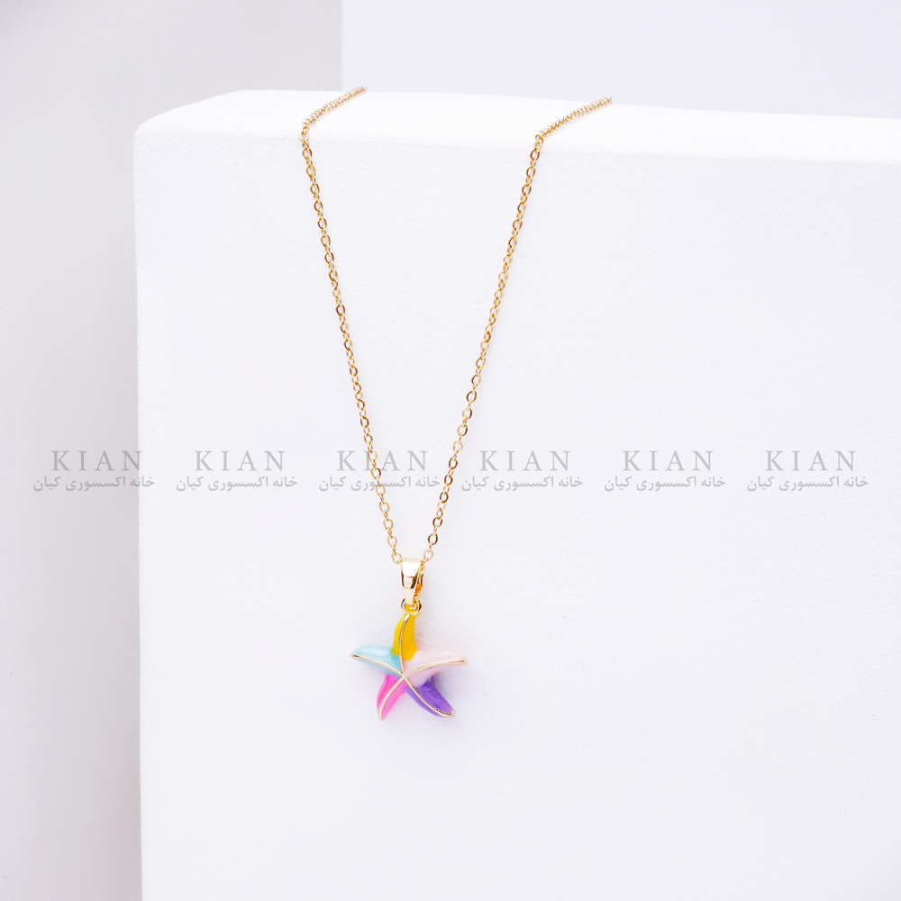 پلاک این گردنبند به شکل یک ستاره کوچک طراحی شده که هر بخش آن با رنگهای ملایم و جذاب مثل صورتی، بنفش و زرد پوشیده شده است. این ترکیب رنگی شاد باعث میشود گردنبند برای استایلهای روزمره، استایل تابستانی، دانشگاه و مهمانیهای دوستانه گزینهای فوقالعاده باشد.