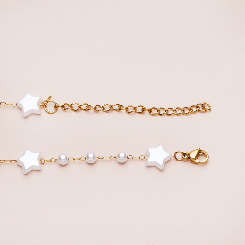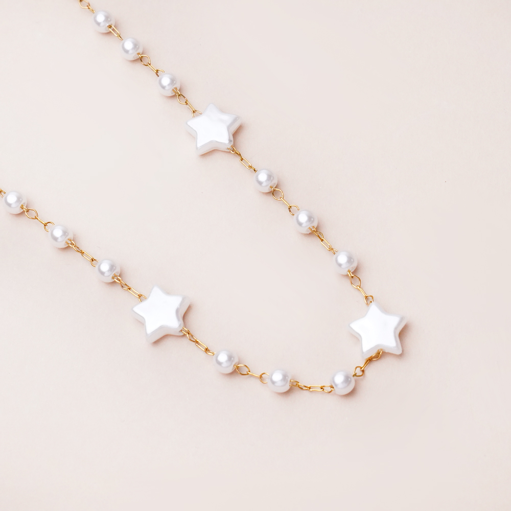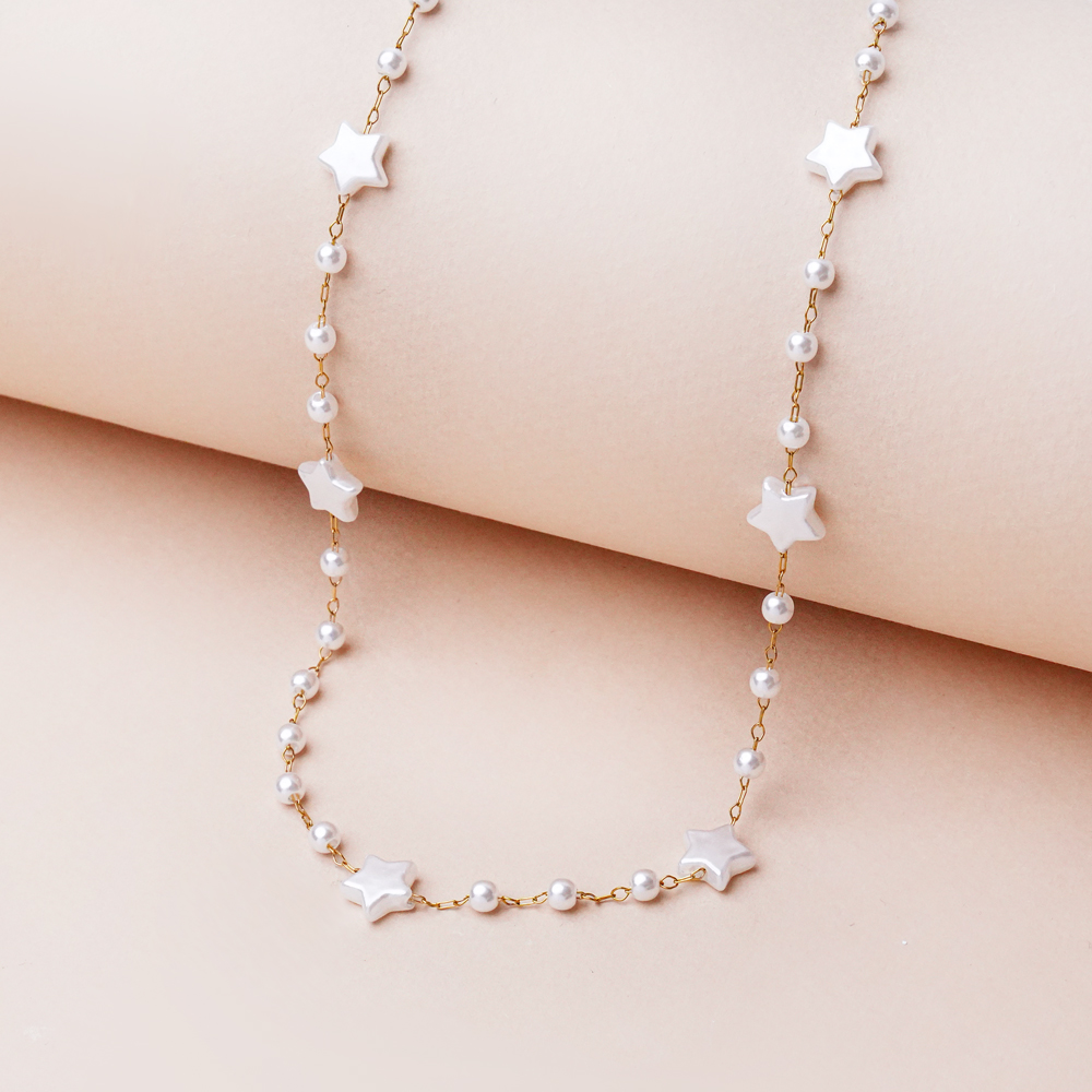 یه گردنبند ظریف و رؤیایی که ترکیب ستاره‌ی صدفی با مرواریدهای ریز، حس لطافت و درخشش ملایمی به استایل می‌ده. فرم ستاره، حال‌وهوای فانتزی و دوست‌داشتنی داره و در کنار بافت نرم مروارید، ظاهر گردنبند رو خاص و دلنشین کرده. از اون مدل‌هاییه که نه شلوغه، نه ساده‌ی معمولی؛ دقیقاً همون جزئیات ظریفی که استایل رو قشنگ‌تر و متفاوت‌تر نشون می‌ده. مناسب استفاده‌ی روزمره یا هدیه دادن به کسی که اکسسوری‌های لطیف و خاص رو دوست داره.