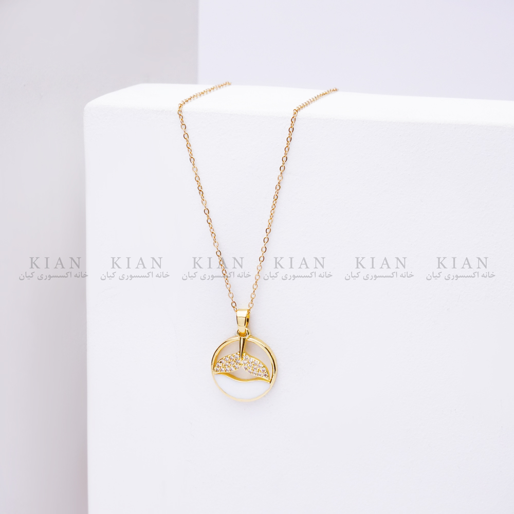 پلاک این گردنبند به شکل نیم‌دایره طراحی شده و قسمت پایینی آن با طرح موج سفید صدفی پوشیده شده است. این سطح صدفی در برخورد با نور، برق ملایمی ایجاد می‌کند و حس لطافت و آرامش دریا را منتقل می‌کند. قاب طلایی که دورتادور پلاک قرار دارد، ظاهر مدل را مرتب‌تر و لوکس‌تر کرده و تضاد رنگی زیبایی با بخش سفید ایجاد می‌کند.