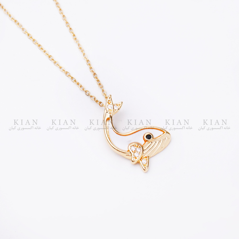 پلاک این گردنبند به شکل یک ماهی کوچک طراحی شده و قسمت میانی آن با طرح صدفی سفید براق تزئین شده است. این بخش صدفی در برخورد با نور، درخششی ملایم ایجاد میکند و جلوهای لطیف و تمیز به گردنبند میبخشد. قاب طلایی ظریف دور ماهی نیز مدل را مرتبتر، شیکتر و چشمگیرتر کرده است.