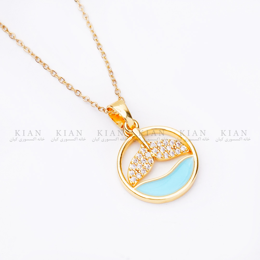 پلاک این گردنبند به شکل دایره طراحی شده و نیمه پایینی آن با طرح موج آبی تزئین شده است. این بخش آبی‌ رنگ با جلوه‌ای صدفی و براق، در برخورد با نور به زیبایی می‌درخشد و حسی شبیه نور دریا در آفتاب را تداعی می‌کند. بخش بالایی پلاک با روکش طلایی براق کامل شده که تضاد زیبایی با رنگ آبی ایجاد کرده است.