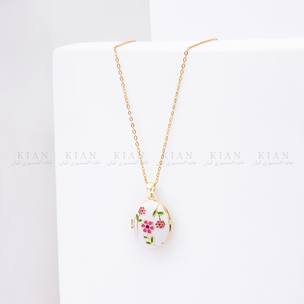 پلاک این گردنبند به شکل یک بیضی کوچک طراحی شده و سطح آن با گلهای ریز صورتی و طرحهای ظریف مینیمال تزئین شده است. این جزئیات رنگی در کنار قاب طلایی براق، جلوهای لطیف و زنانه ایجاد میکند و مدل را برای استایلهای روزمره، دانشگاه، مهمانیهای دوستانه و حتی هدیه دادن بسیار مناسب میسازد.